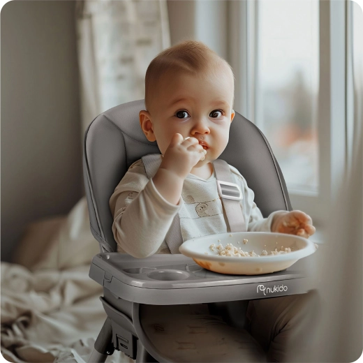 Praktyczne i bezpieczne krzesełko do karmienia NUKIDO Tilo 3w1 w eleganckim szarym kolorze rośnie razem z Twoim maluszkiem od 6. miesiąca. Oferuje zdejmowany i regulowany blat, łatwe w czyszczeniu materiały oraz 5‑punktowe pasy bezpieczeństwa. Dzięki stabilnym nogom z antypoślizgową końcówką i stabilnej podpórce pod nogi jest idealne nie tylko do karmienia, ale także do zabawy, rysowania i pierwszego czytania.