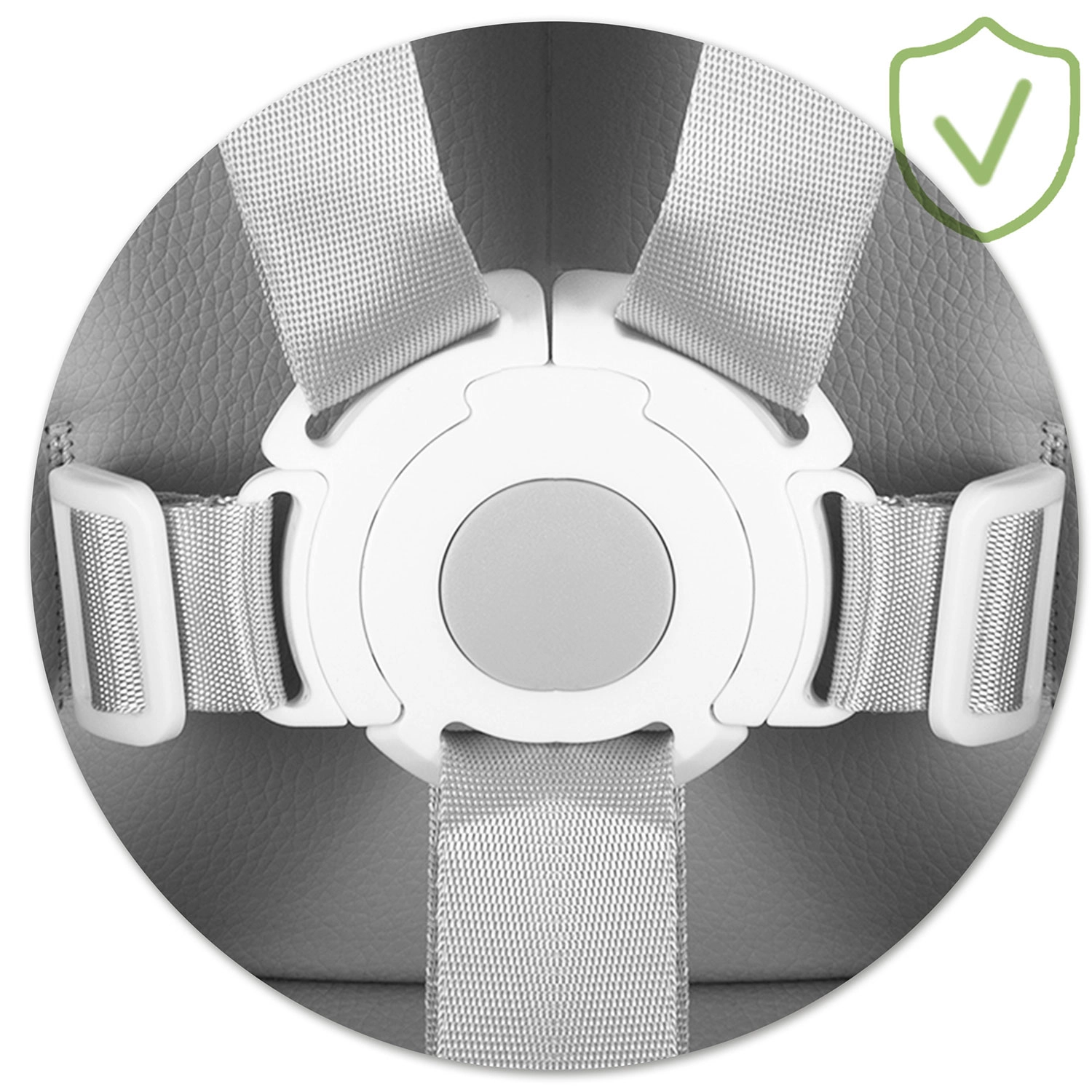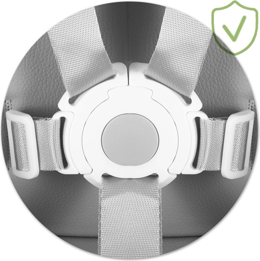 5‑punktowe pasy, szeroka podstawa i antypoślizgowe stopki utrzymują krzesełko stabilnie na miejscu. Stabilna podpórka pod nogi wspiera prawidłową postawę ciała.