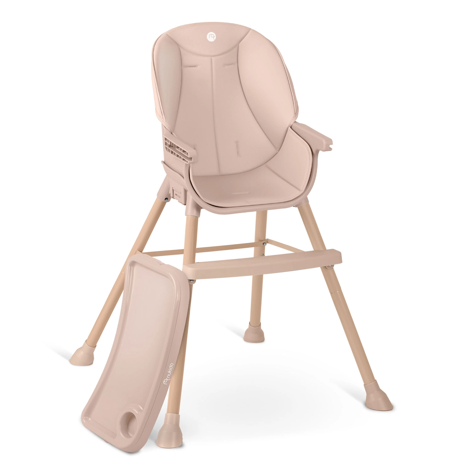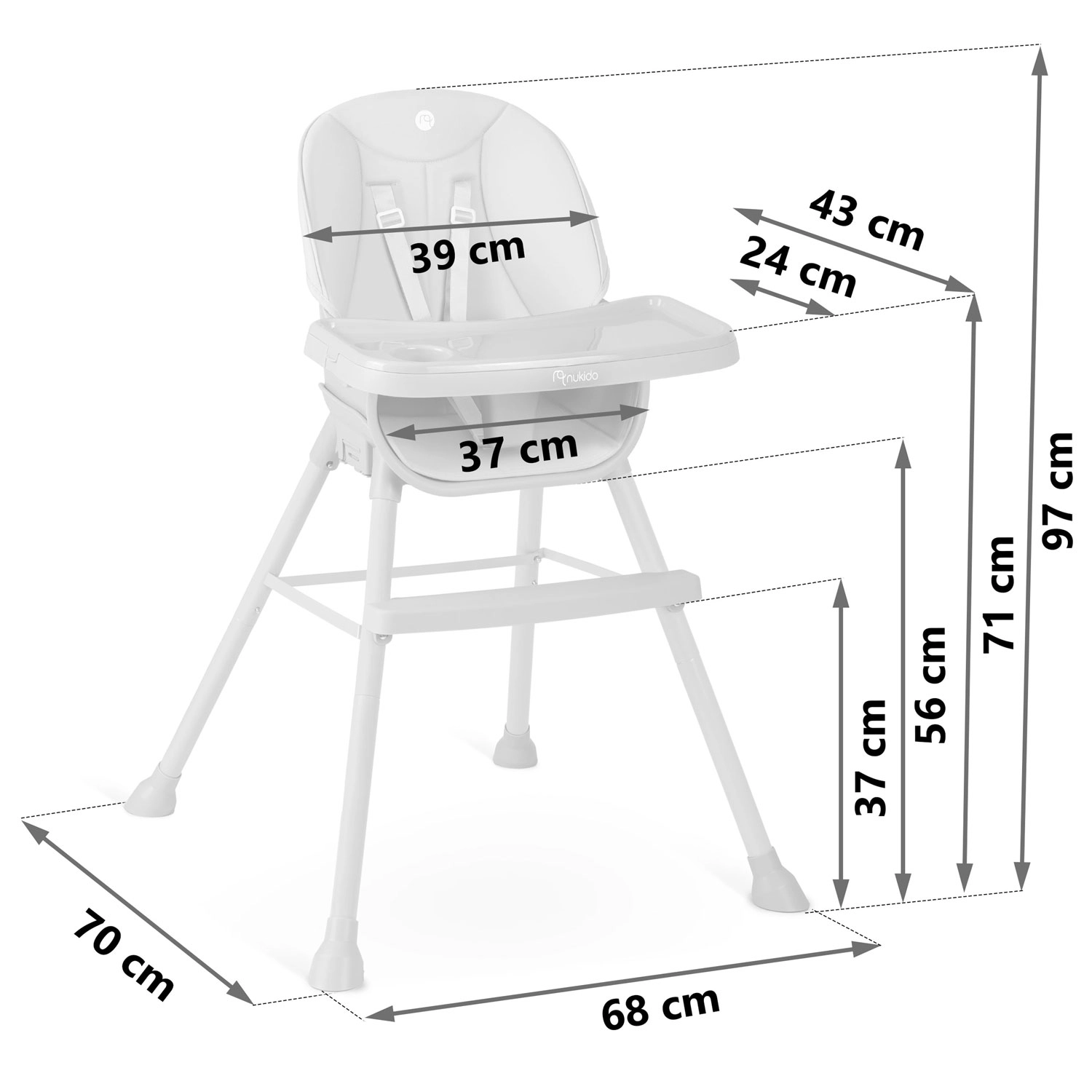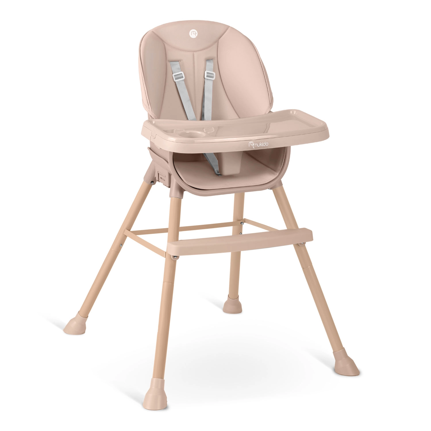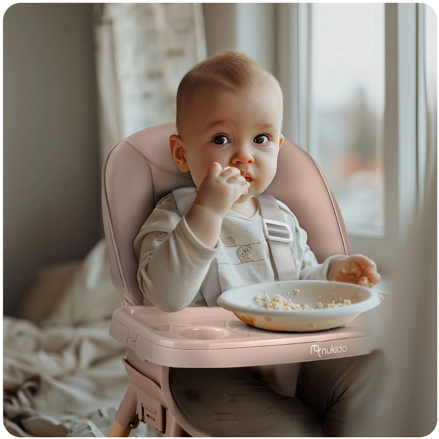 NUKIDO Tilo to wszechstronne dziecięce krzesełko do karmienia 3w1, które z łatwością przekształcisz z wysokiego krzesełka w niskie krzesełko dla malucha lub w samodzielne siedzisko. Dzięki płynnej regulacji odległości tacki i jej szybko odpinanej wkładce utrzymasz porządek w kilka chwil – wystarczy zdjąć wkładkę i opłukać lub włożyć do zmywarki.