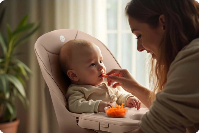 - Bezpieczeństwo zgodne z EN 14988 – 5‑punktowe pasy, stabilne nogi, antypoślizg