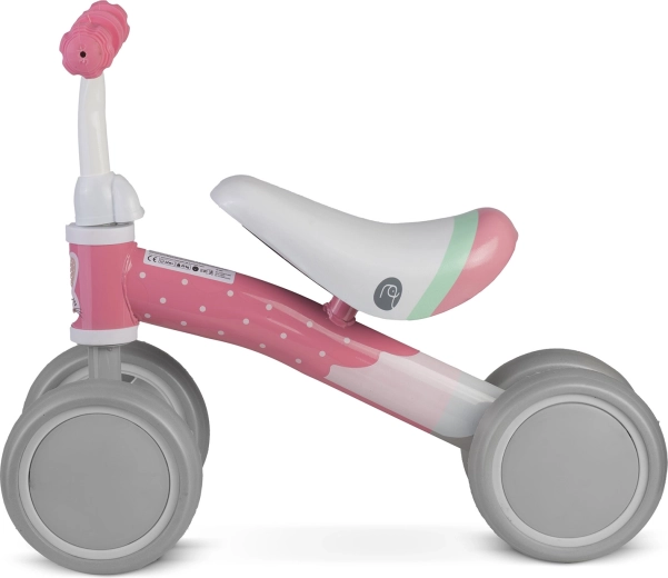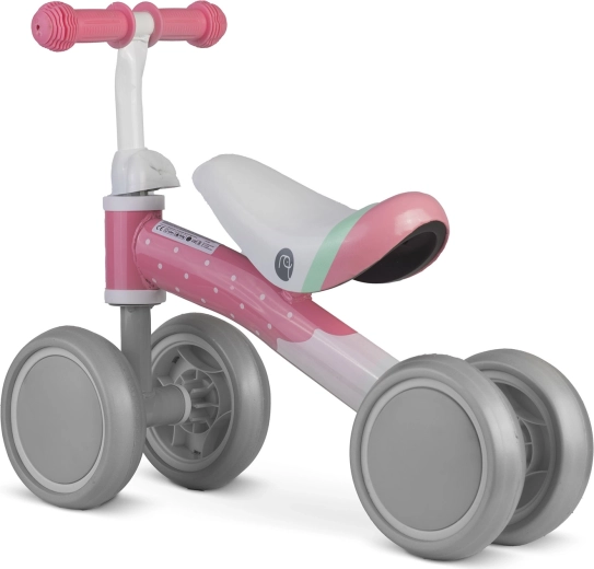 Lekkie dziecięce jeździdło z czterema kołami dla najmłodszych pomaga rozwijać równowagę i pewność podczas jazdy. Oferuje stabilne, szerokie kółka, wytrzymałą metalową ramę, miękkie piankowe siodełko oraz gumowe chwyty z ogranicznikami dla bezpiecznego uchwytu. Produkt pochodzi z serii outletowej z drobnych estetycznych niedoskonałości, które nie wpływają na funkcjonalność ani komfort jazdy.