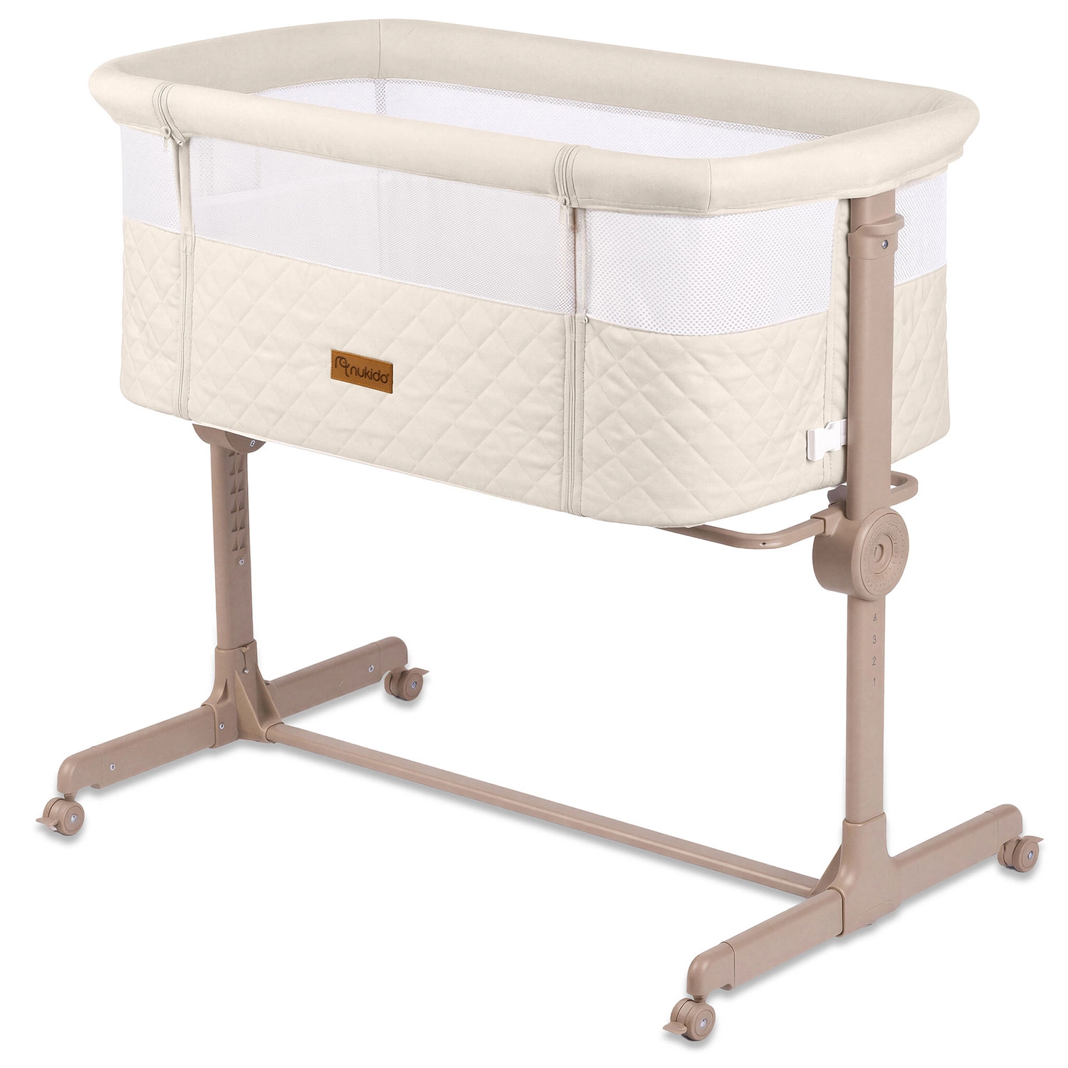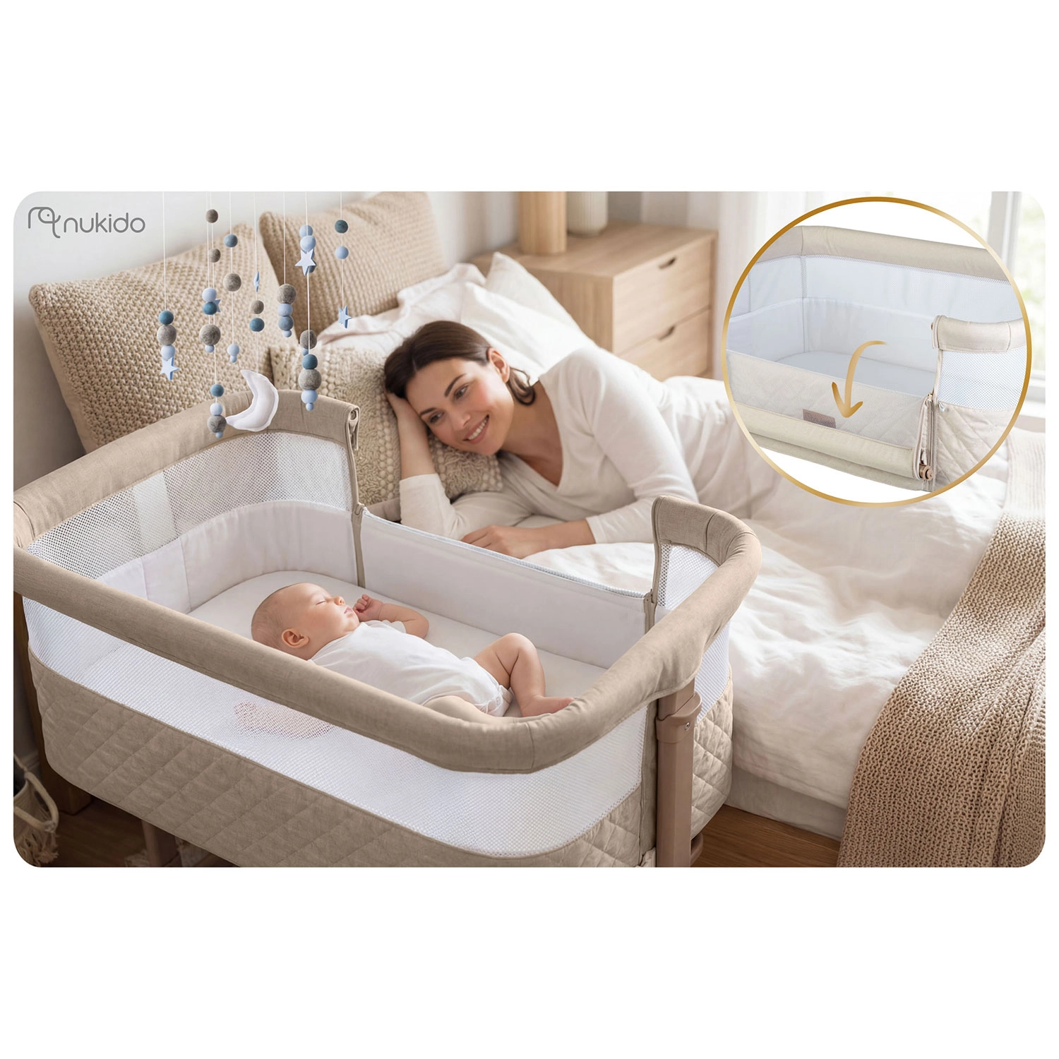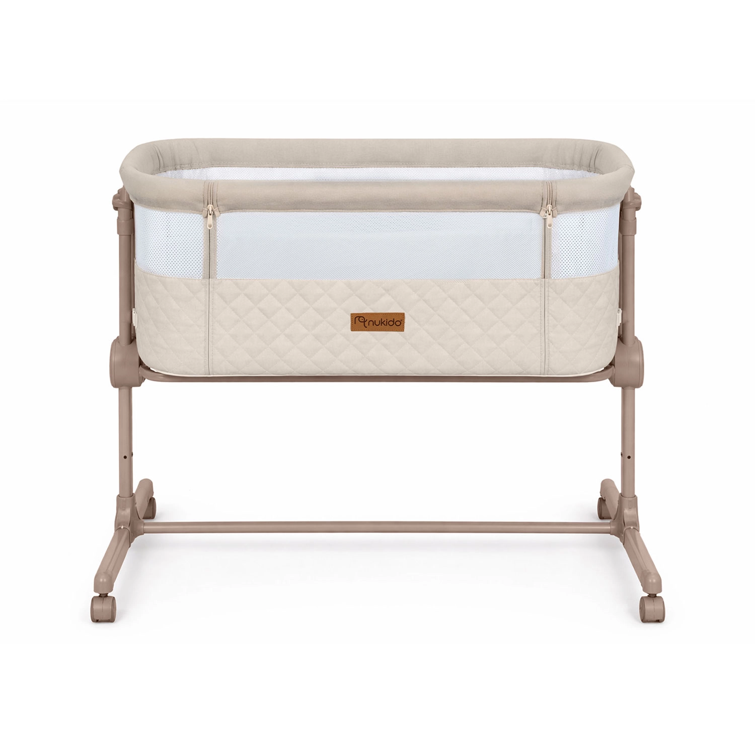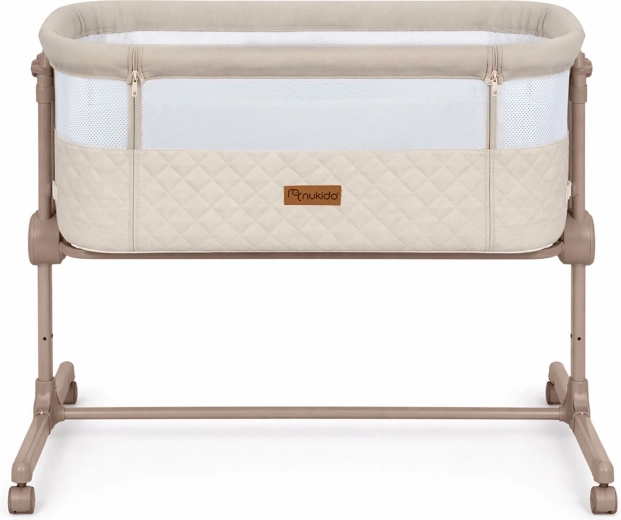Praktyczne i bezpieczne łóżeczko dostawne NUKIDO dla noworodków oferuje 7 poziomów regulacji wysokości, niezależne nachylenie obu stron dla wygody także przy refluksie, odpinany boczny panel na zamek dla łatwego dostępu w nocy oraz 4 kółka z hamulcami dla mobilności w domu. W zestawie znajduje się materac z możliwością prania pokrowca oraz pasy do bezpiecznego przymocowania do łóżka rodziców.