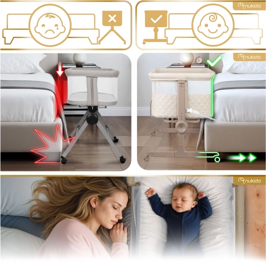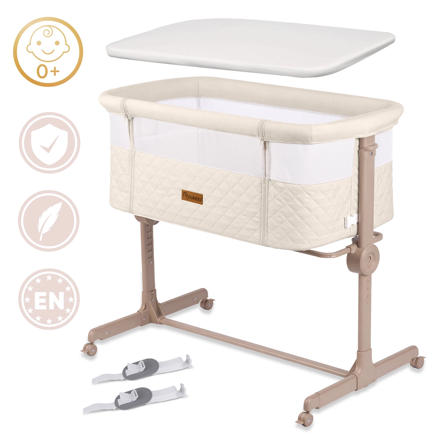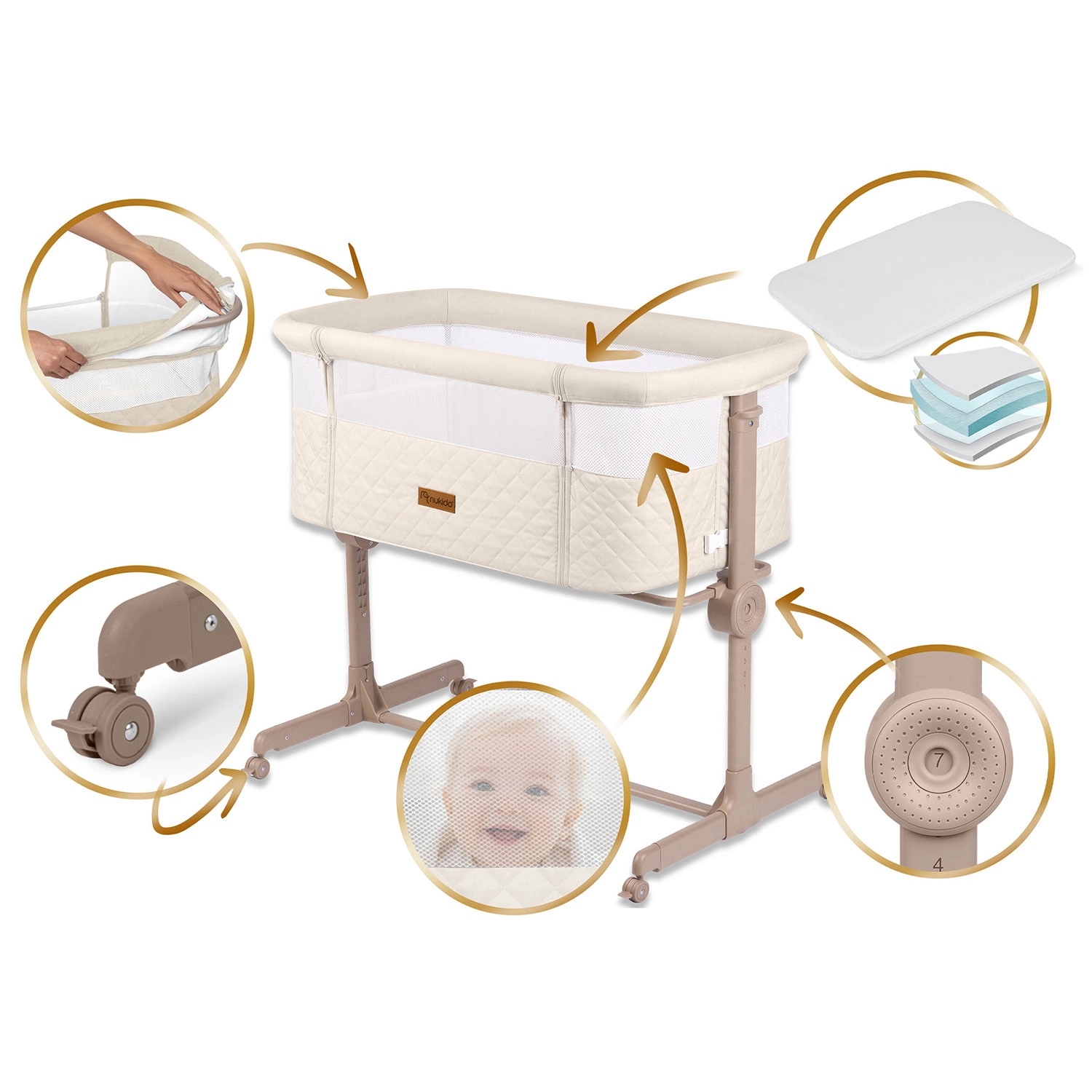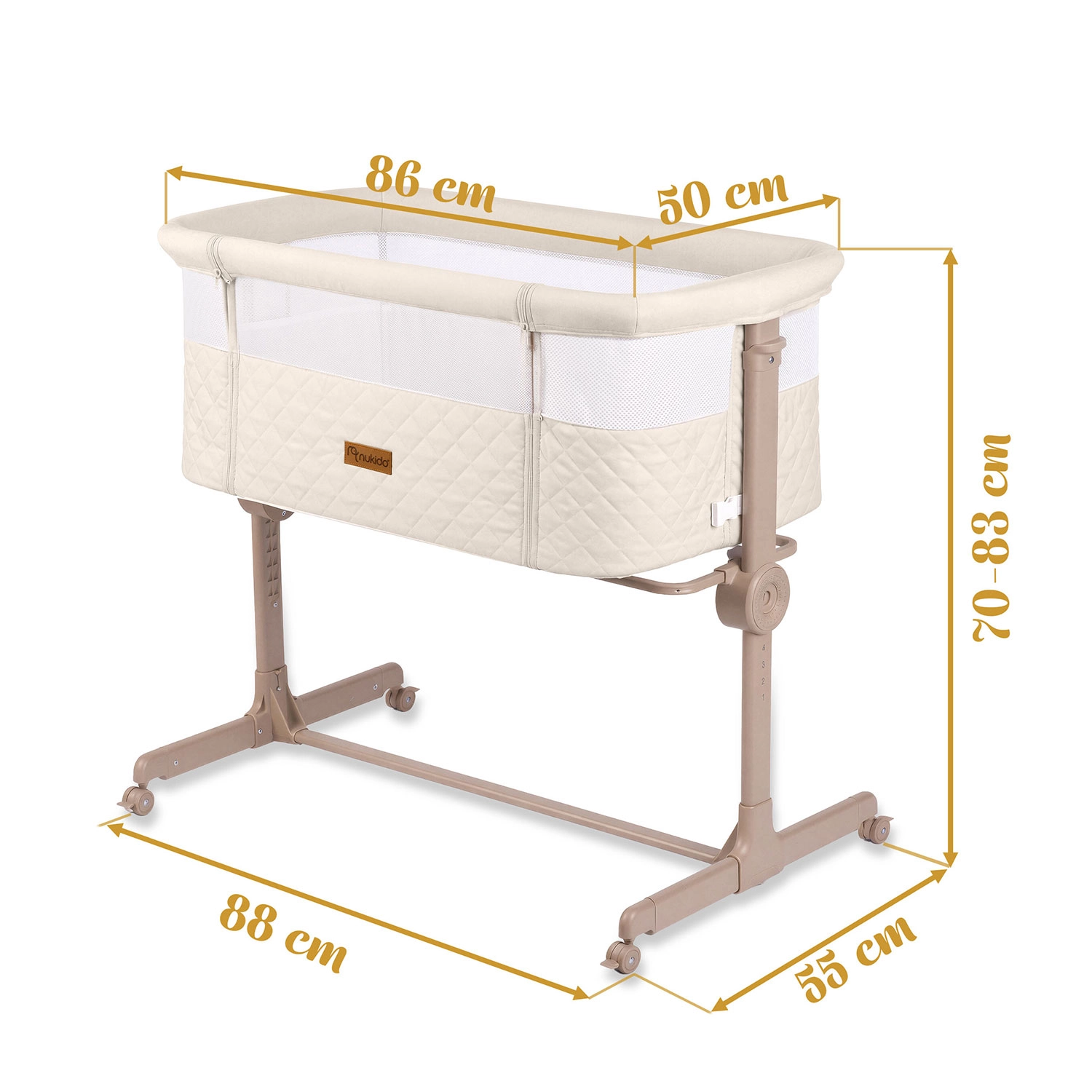 Praktyczne i bezpieczne łóżeczko dostawne NUKIDO dla noworodków oferuje 7 poziomów regulacji wysokości, niezależne nachylenie obu stron dla wygody także przy refluksie, odpinany boczny panel na zamek dla łatwego dostępu w nocy oraz 4 kółka z hamulcami dla mobilności w domu. W zestawie znajduje się materac z możliwością prania pokrowca oraz pasy do bezpiecznego przymocowania do łóżka rodziców.