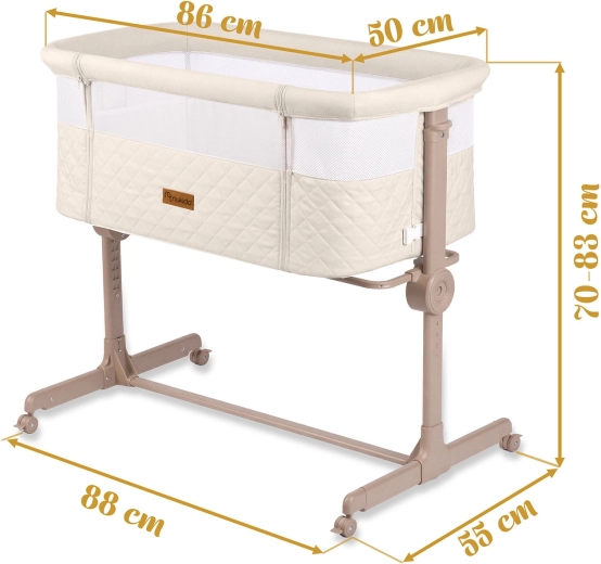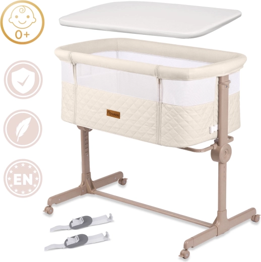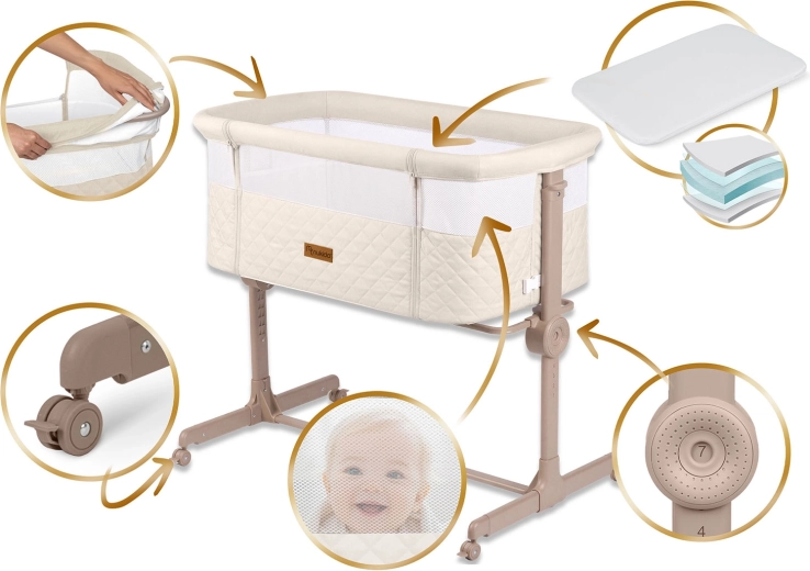 - Bezpieczna bliskość – mocowanie do łóżka pasami oraz boczna ścianka otwierana na zamek ułatwiająca nocne karmienie.
