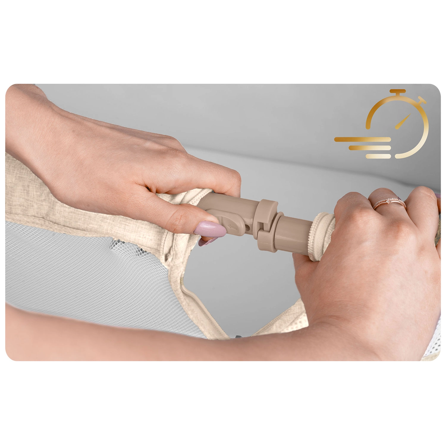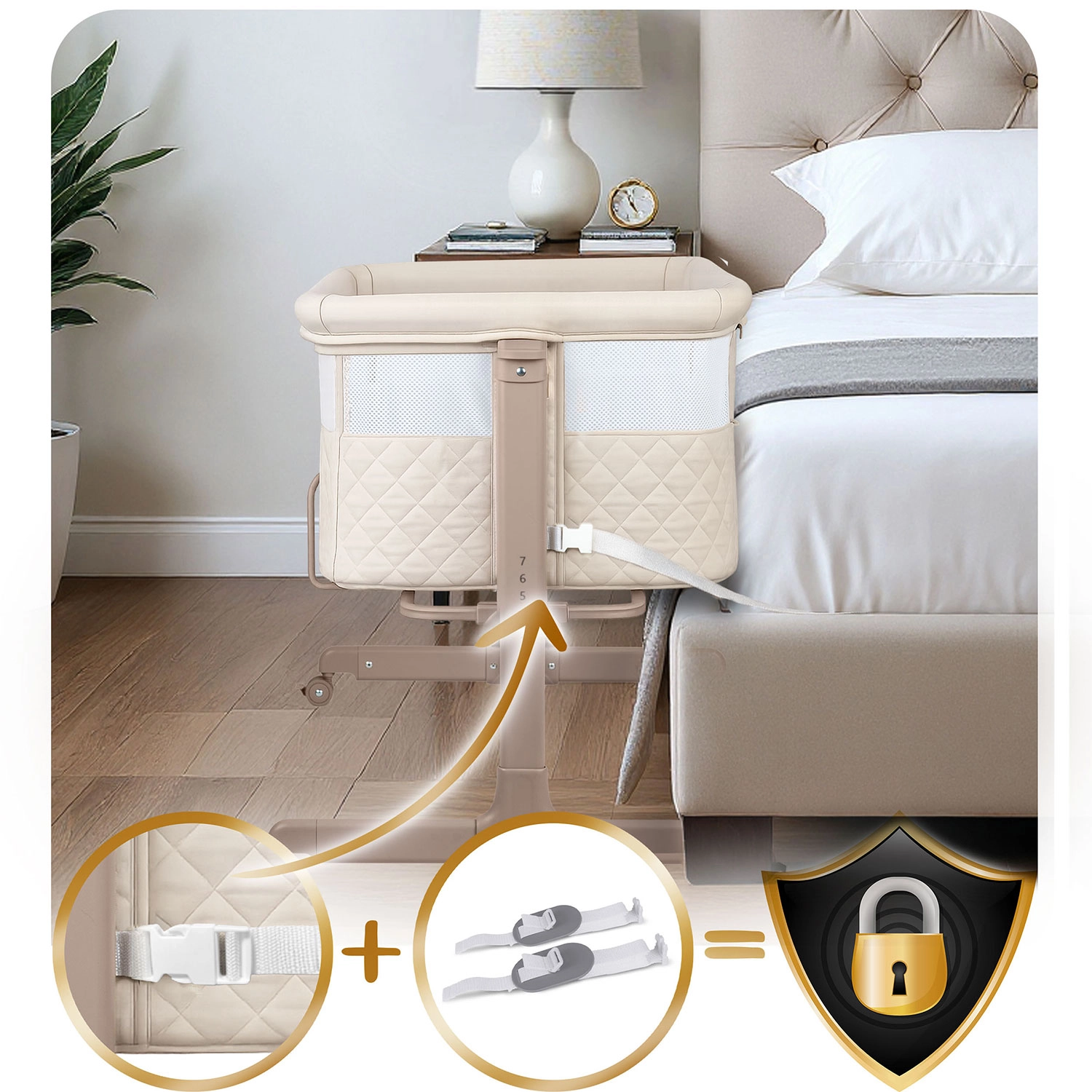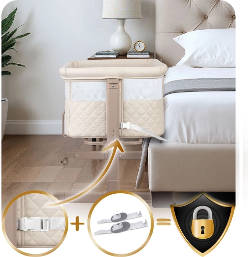 Boczny panel na zamek otwiera się na zewnątrz, aby dziecko nie mogło go otworzyć. Pasy mocujące solidnie łączą łóżeczko z łóżkiem rodziców dla maksymalnej stabilności.