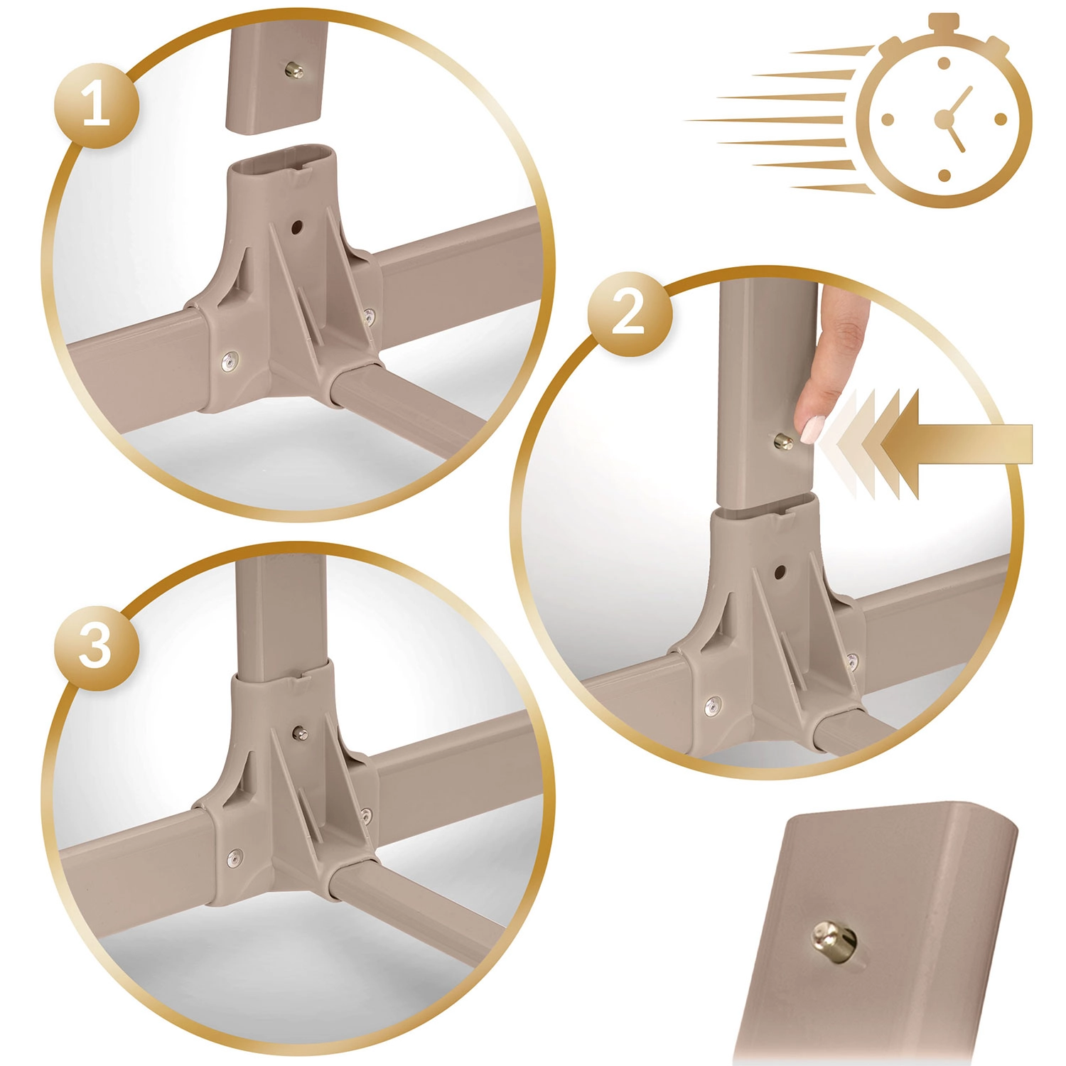 System Quick Click umożliwia błyskawiczny montaż bez narzędzi. Pokrowce można zdjąć i wyprać, materac ma zdejmowany, oddychający pokrowiec.