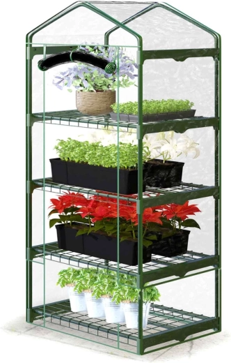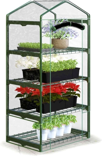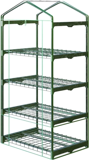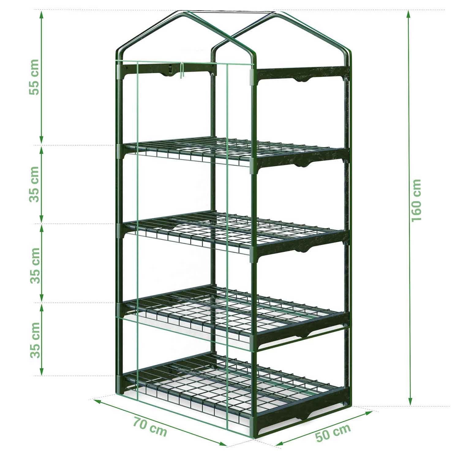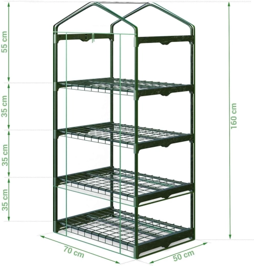 Dzięki półkom uzyskasz przejrzyste rozmieszczenie rozsady i pojemników uprawowych, a dolną przestrzeń można wykorzystać na akcesoria ogrodowe. Przednie drzwi z dwoma zamkami błyskawicznymi umożliwiają łatwe wietrzenie i wygodną obsługę roślin. Szklarnia nadaje się do użytkowania przez cały sezon na balkonie, tarasie lub podwórzu.