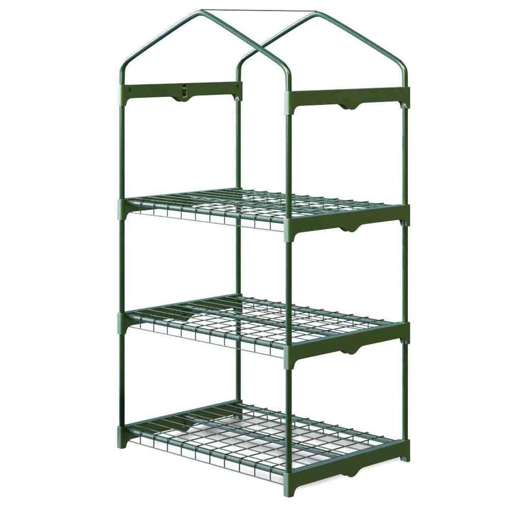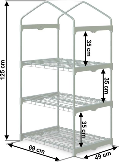 Trzypoziomowy układ z odstępem między półkami 35 cm oszczędza miejsce i pomieści rozsady, zioła oraz mniejsze skrzynki.