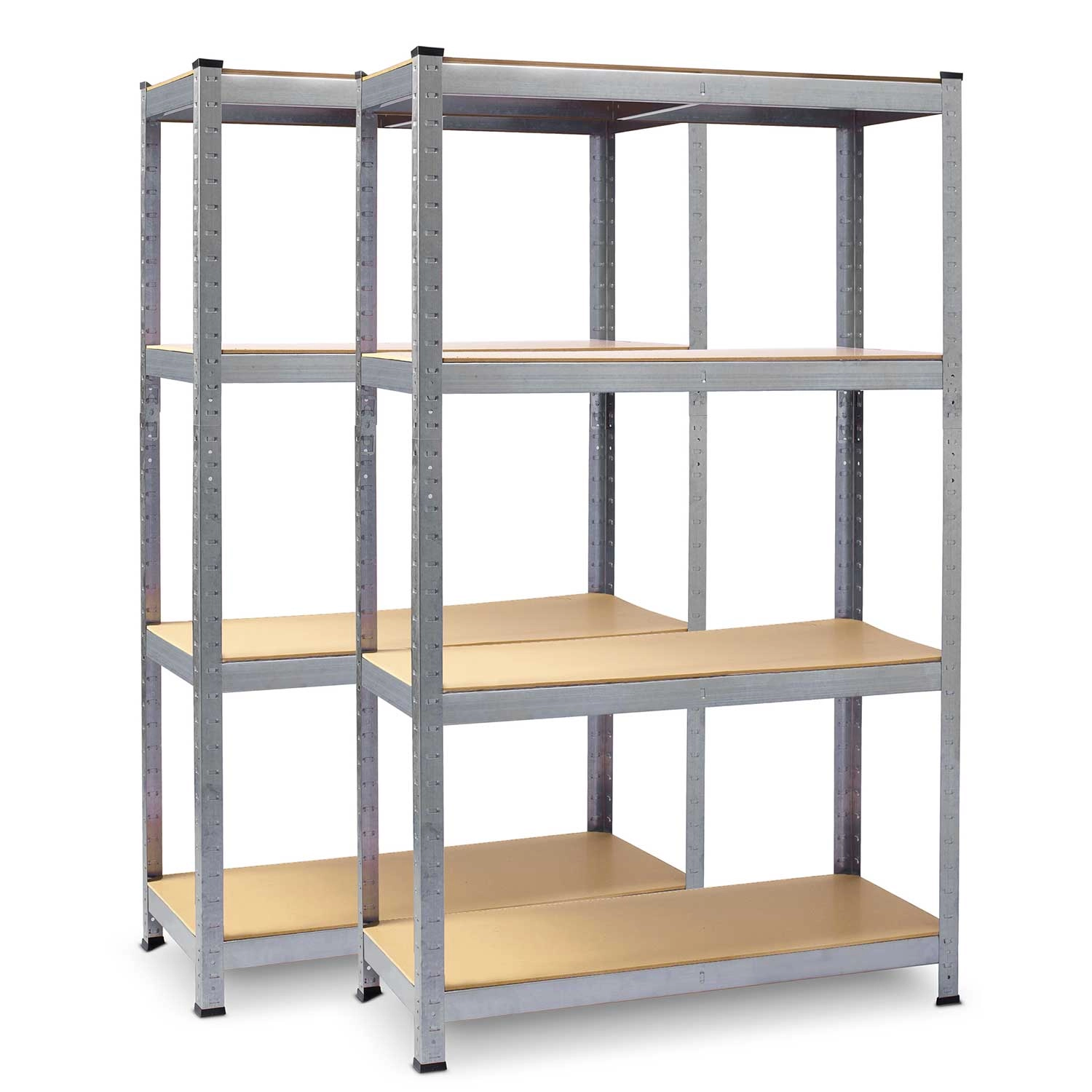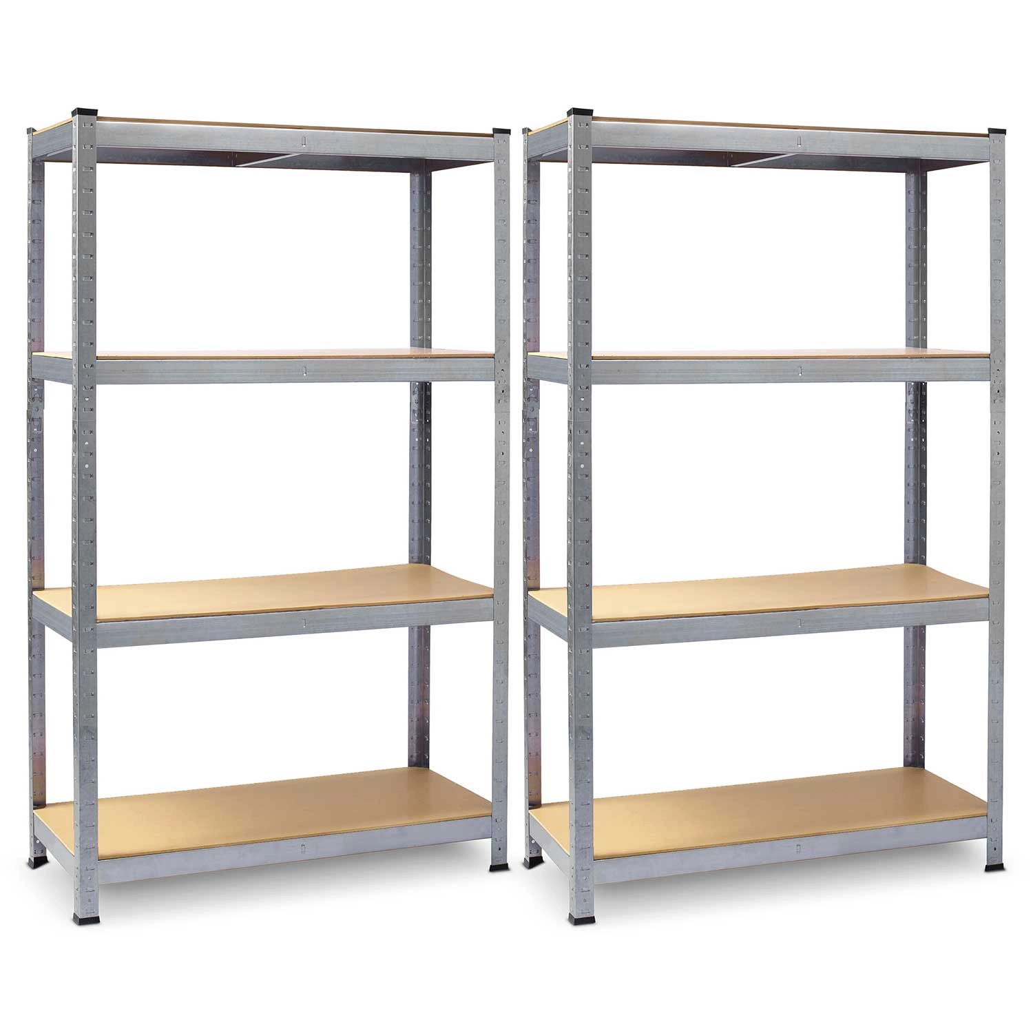Ten zestaw 2 wytrzymałych regałów magazynowych w wykończeniu galwanizowanym idealnie nadaje się do przejrzystego przechowywania narzędzi, pojemników i pudeł archiwizacyjnych. Każdy regał ma 4 trwałe półki z MDF (grubość 3,3 mm) z centralnymi wzmocnieniami i udźwigiem do 135 kg na półkę, dzięki czemu bez problemu poradzi sobie z cięższym wyposażeniem.
