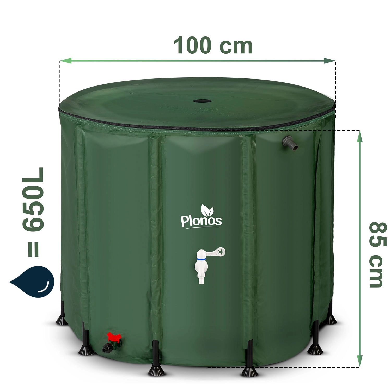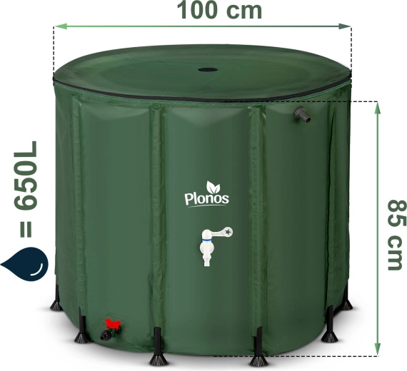 Praktyczny i wytrzymały zbiornik na deszczówkę o pojemności 650 l marki Plonos oszczędza wodę i pieniądze oraz zapewnia wygodne podlewanie całej przestrzeni ogrodowej. Oferuje kranik z zaworem on/off, dolny spust do węża oraz możliwość podłączenia do rynny. Solidna antykorozyjna rama, odporny na UV płaszcz PVC i łatwy montaż gwarantują długą żywotność i minimalne wymagania przestrzenne po złożeniu.