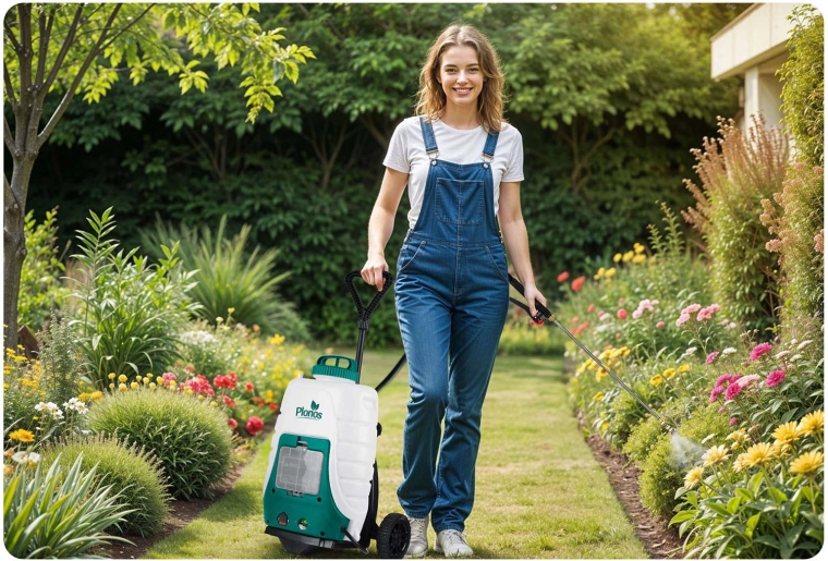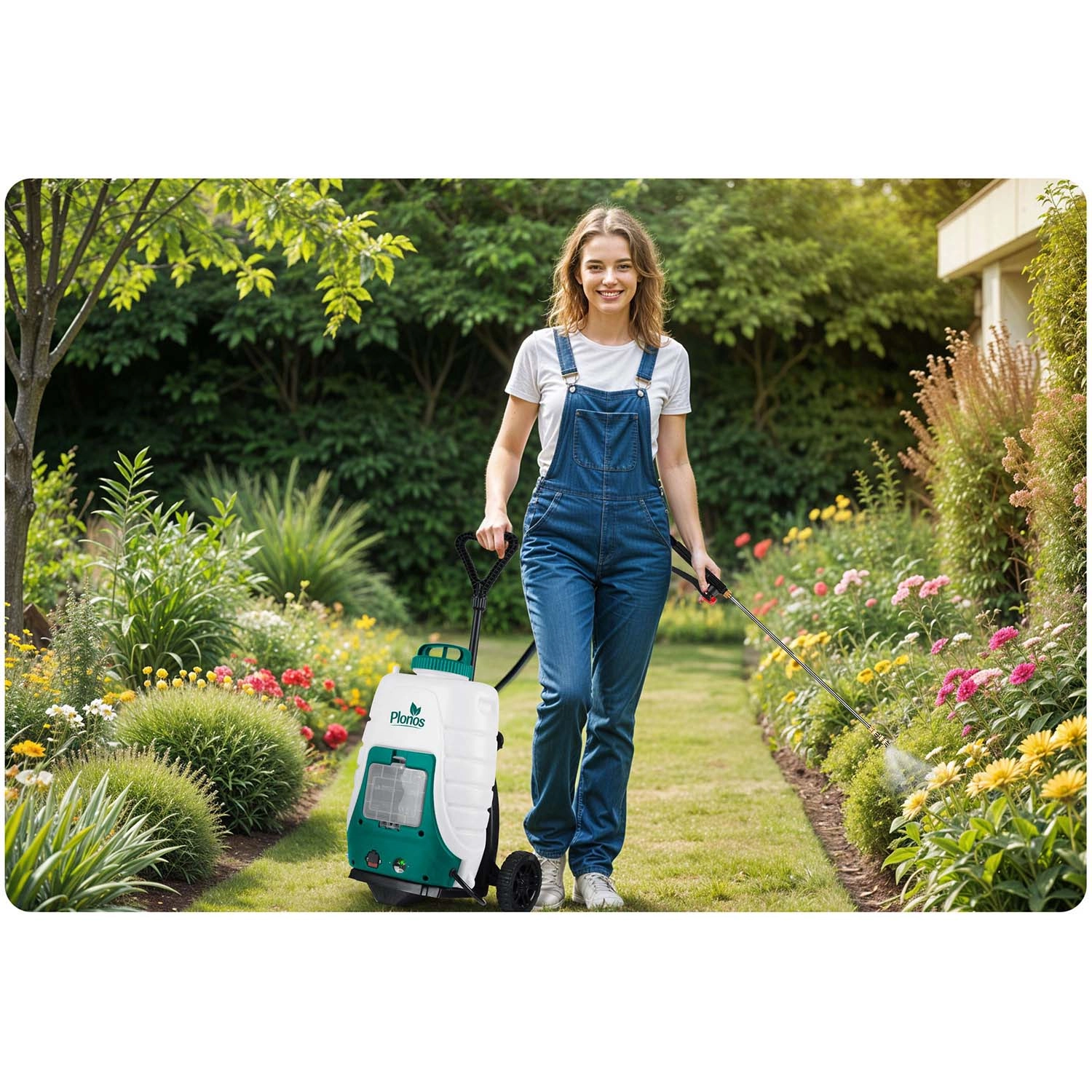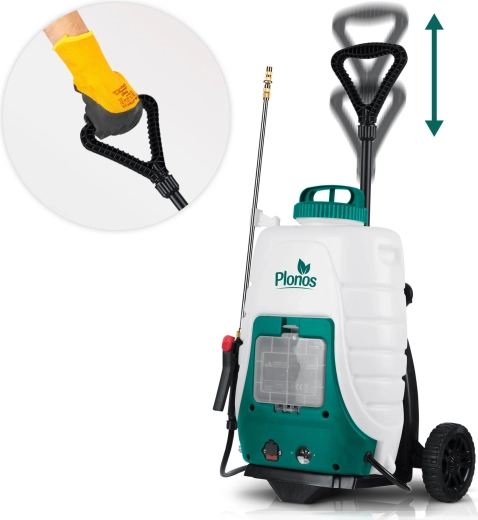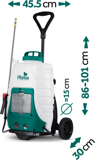 Akumulatorowy opryskiwacz na wózku Plonos łączy wysoką wydajność z maksymalną wygodą. Stabilne podwozie z dużymi kołami, teleskopowa rączka i praktyczna kieszeń na akcesoria ułatwiają manewrowanie w każdym terenie. Regulacja obrotów silnika 2800–3200 obr./min oraz ciśnienie robocze 0,10–0,45 MPa pozwalają ustawić idealny strumień zarówno do wrażliwych roślin, jak i do intensywnych zastosowań.