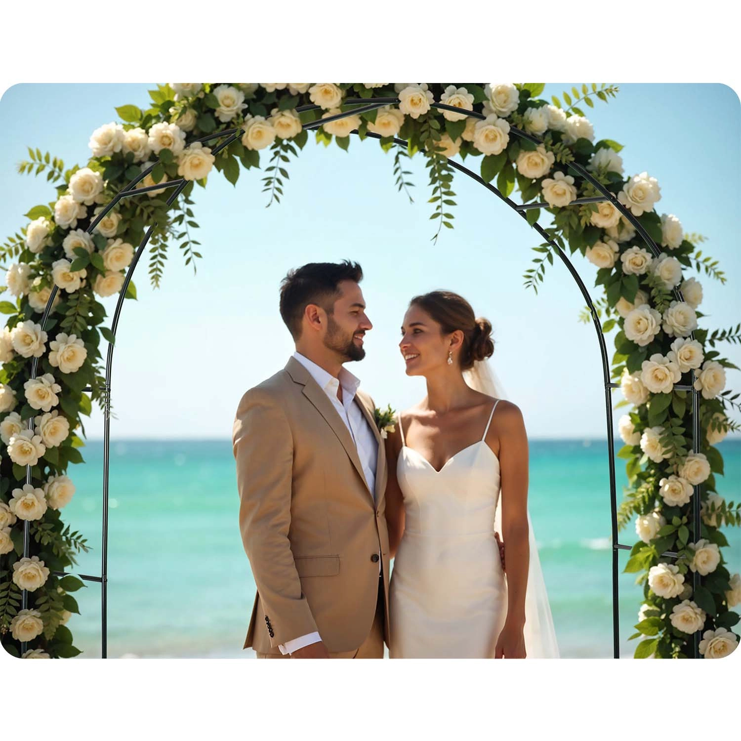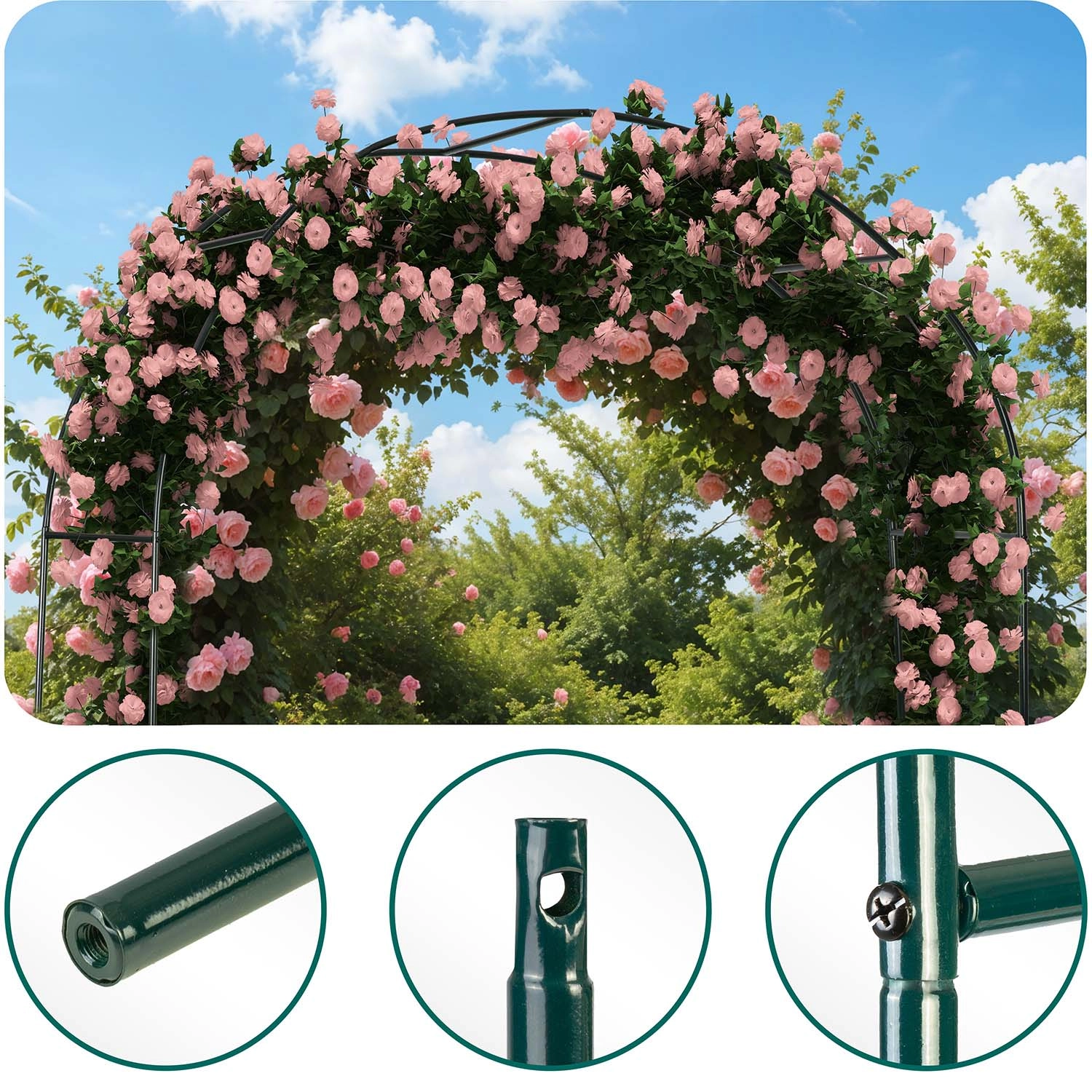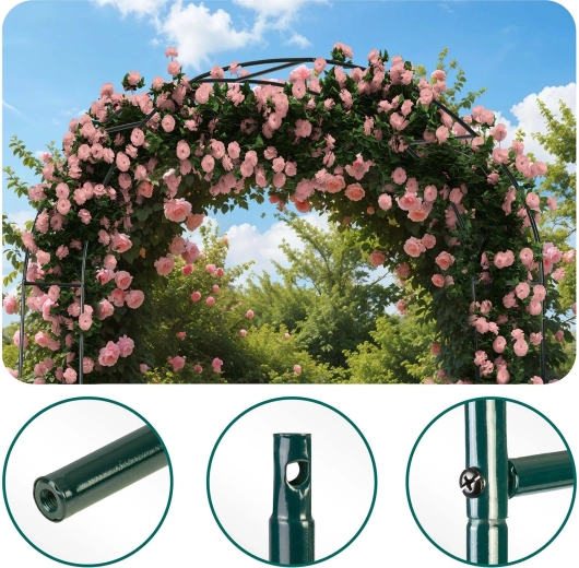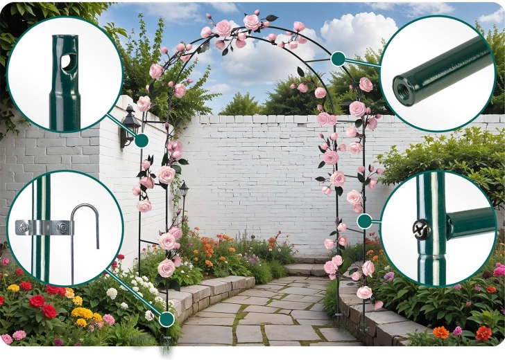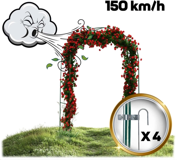 Dzięki stali malowanej proszkowo konstrukcja jest odporna na korozję, deszcz i promieniowanie UV. Intuicyjny montaż nie wymaga specjalistycznych narzędzi, a w zestawie znajdują się 4 kotwy gruntowe oraz śruby montażowe do solidnego zakotwienia. Pergolę możesz uzupełnić łańcuchami świetlnymi, wstążkami lub dekoracjami kwiatowymi, tworząc efektowne aranżacje na śluby, uroczystości i codzienny relaks.