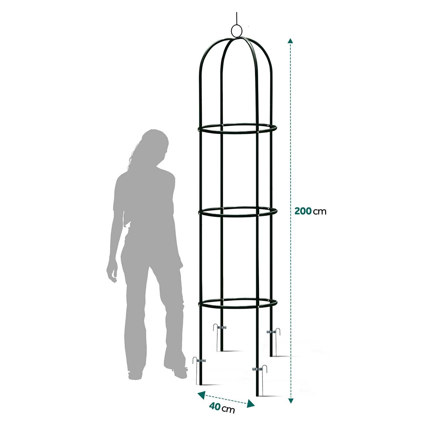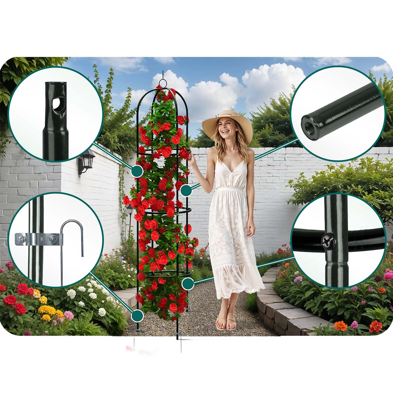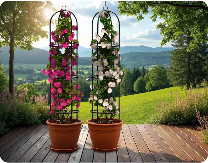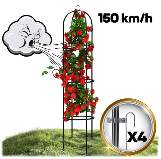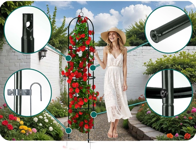 Montaż jest szybki i intuicyjny – poszczególne elementy precyzyjnie do siebie pasują, a potrzebne śruby są częścią zestawu. Cztery kotwy gruntowe utrzymają konstrukcję stabilnie w podłożu, dzięki czemu Twoje rośliny będą rosnąć bezpiecznie i pionowo. Stwórz romantyczne wejście, pionowy akcent na rabacie lub efektowną dekorację w donicy.