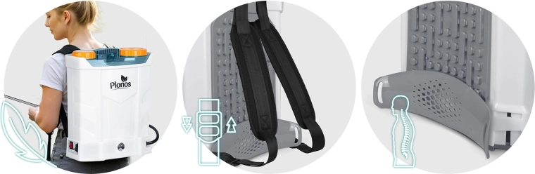 Wyściełane, wzmocnione szelki z regulacją, podkładka lędźwiowa oraz ergonomiczny zbiornik zapewniają komfort nawet podczas dłuższej pracy. Teleskopowa lanca ze stali nierdzewnej ułatwia precyzyjne kierowanie strumienia.