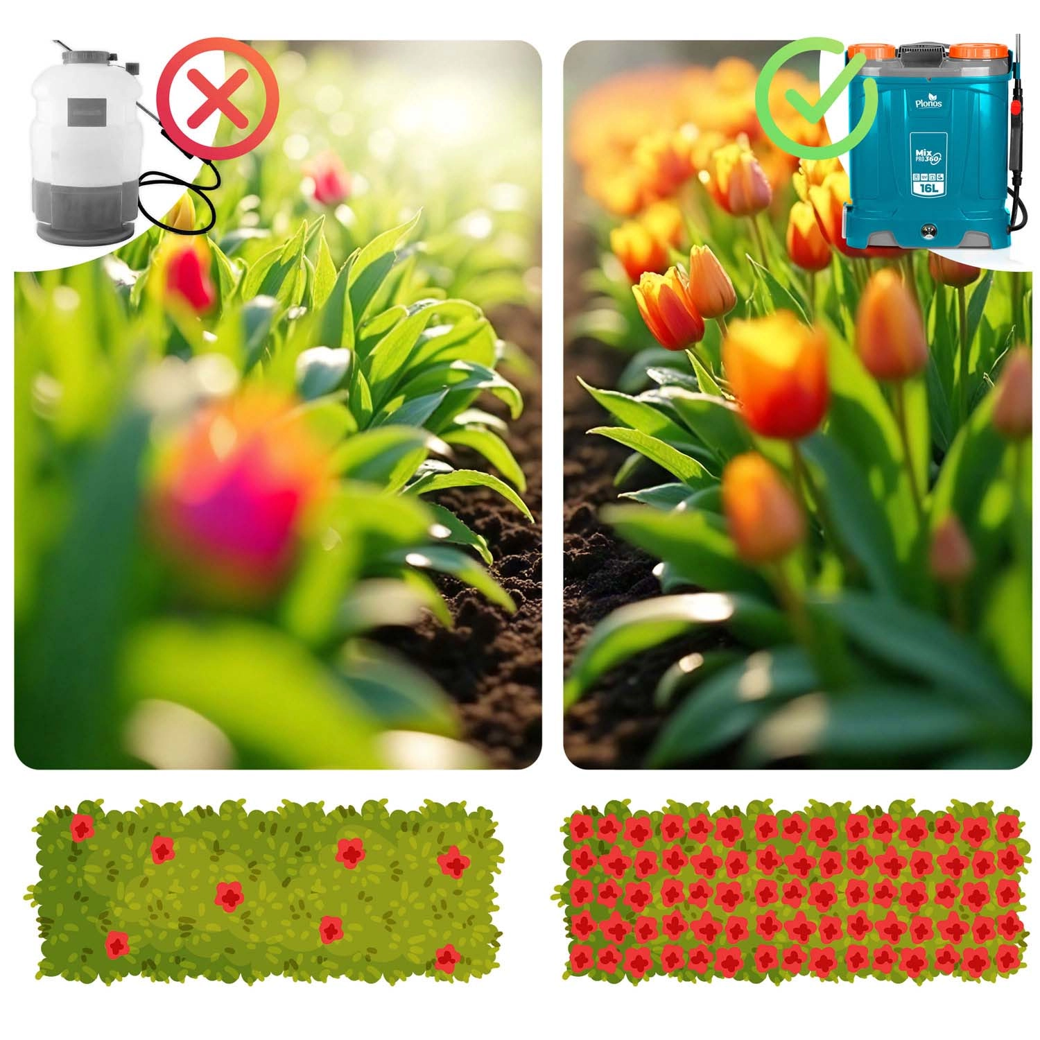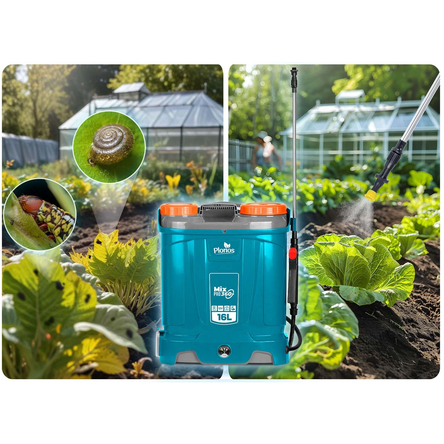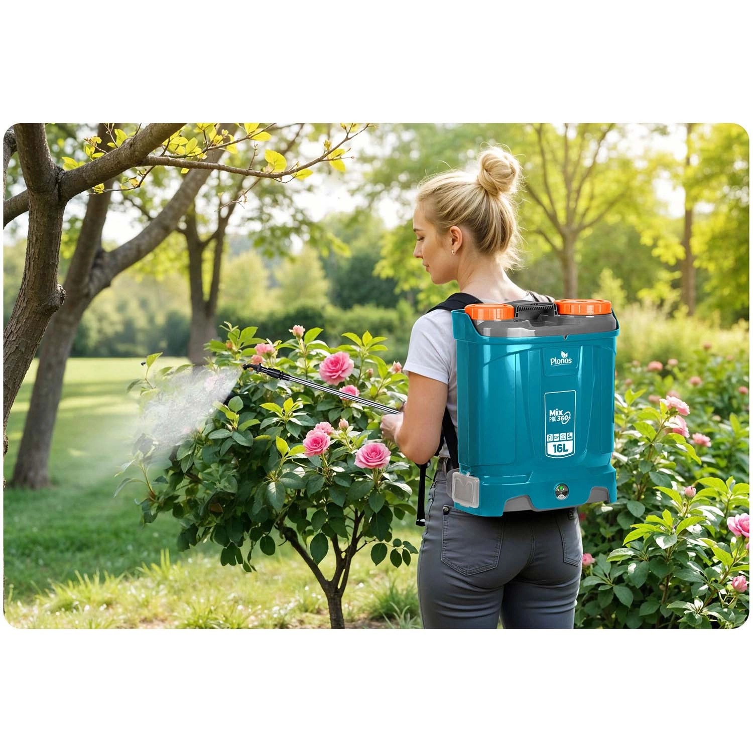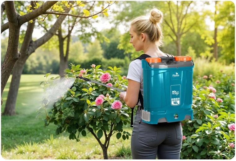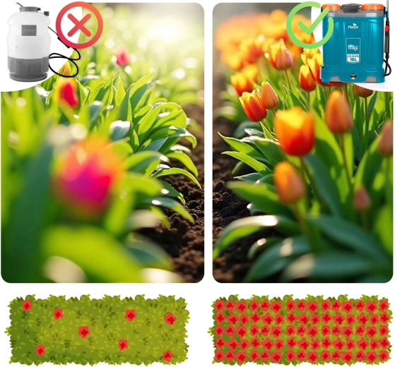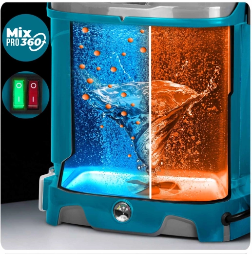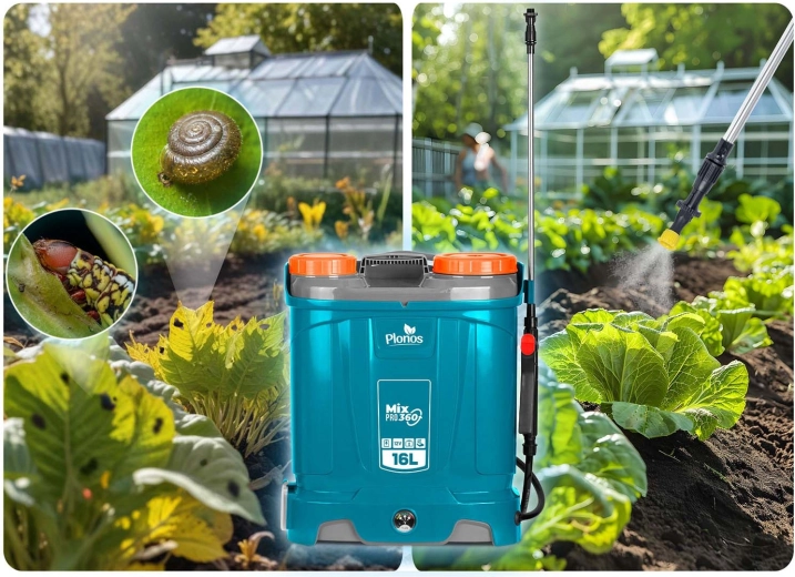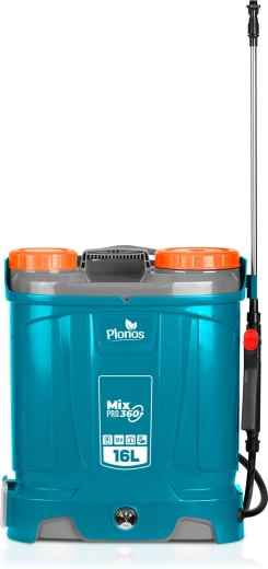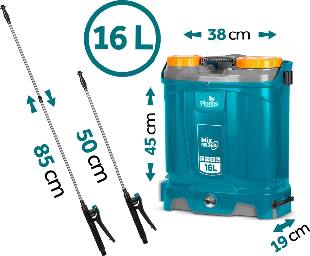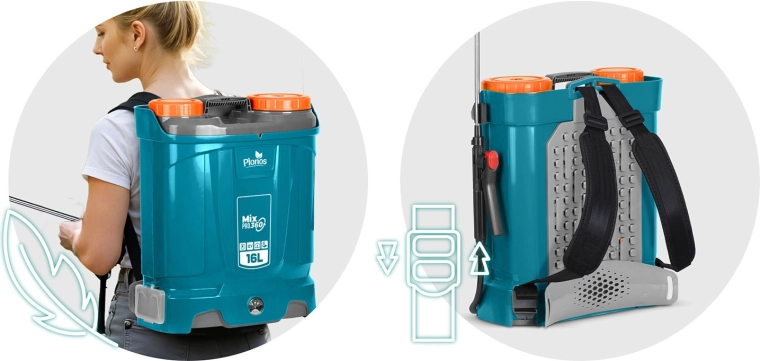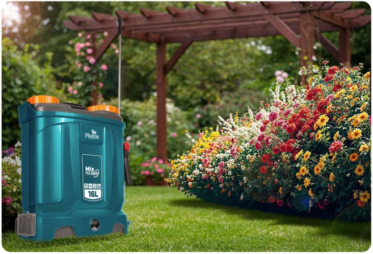 Plonos Mix Pro 360 to akumulatorowy opryskiwacz plecakowy dla wymagających ogrodników i profesjonalistów. Pojemność 16 l, maks. ciśnienie 5,5 bara oraz bogaty zestaw dysz umożliwiają delikatne zamgławianie i celowany strumień do drzew, krzewów i rabat. System mieszania nieustannie porusza zawartością zbiornika, dzięki czemu każdy oprysk ma to samo stężenie, a rośliny otrzymują dokładnie to, czego potrzebują.