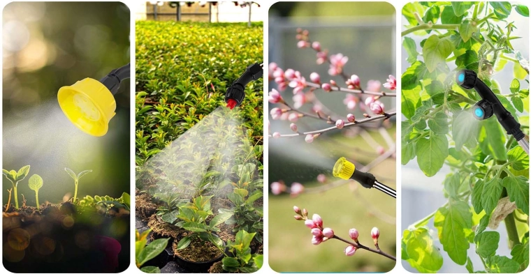 Delikatna mgiełka dla wrażliwych roślin, płaski strumień do krzewów i drzew, czterootworowa regulowana dysza do uniwersalnego zastosowania oraz podwójna głowica do szybkiego pokrywania szerokich rabat.