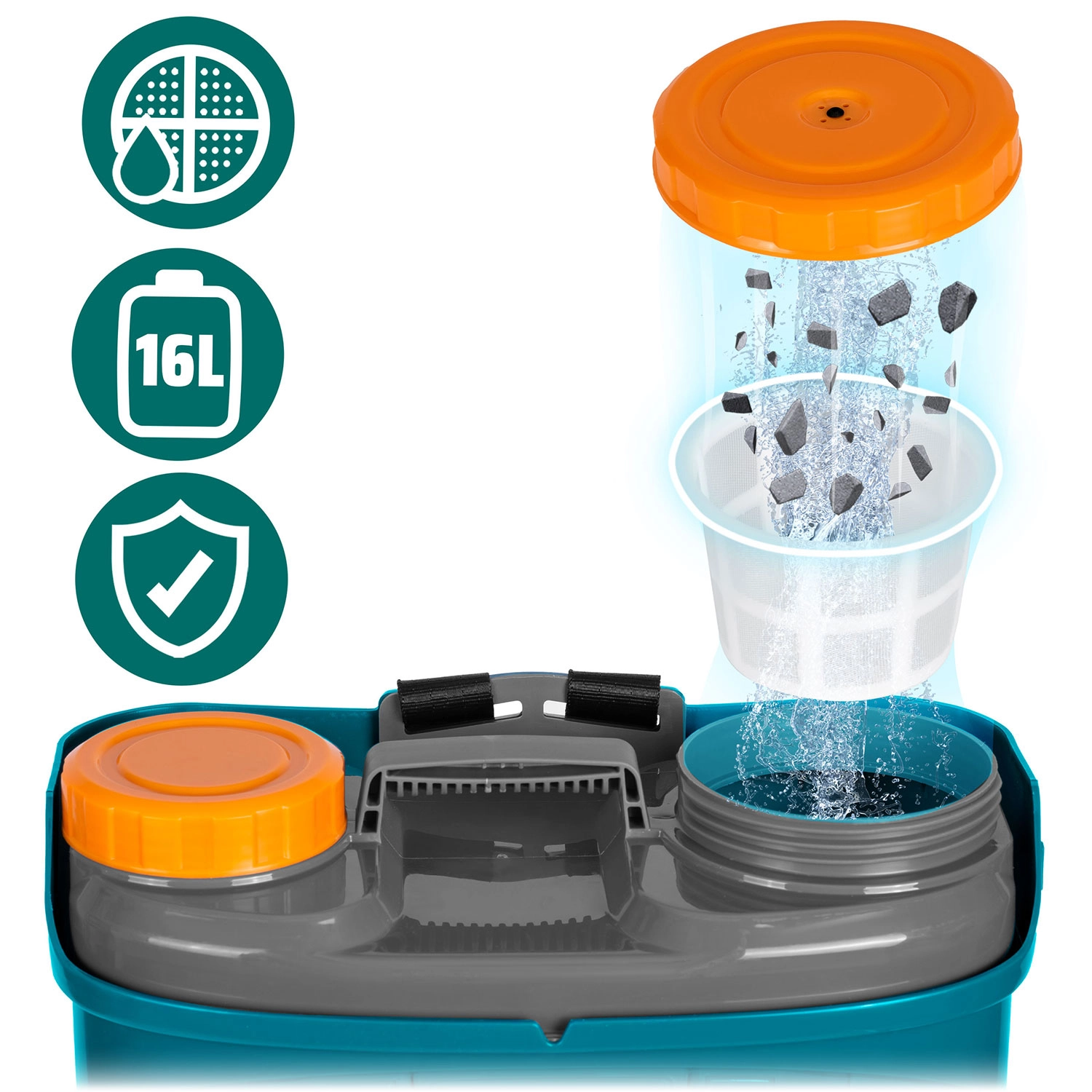 Dzięki akumulatorowi 12 V / 8 Ah zyskasz nawet 9 godzin cichej pracy. Sitko filtracyjne chroni przed zanieczyszczeniami i zatykaniem, a wskaźnik LED poziomu naładowania informuje o energii. Ergonomiczne pasy plecakowe z wyściółką oraz podkładka lędźwiowa zwiększają komfort także przy dłuższej pracy.