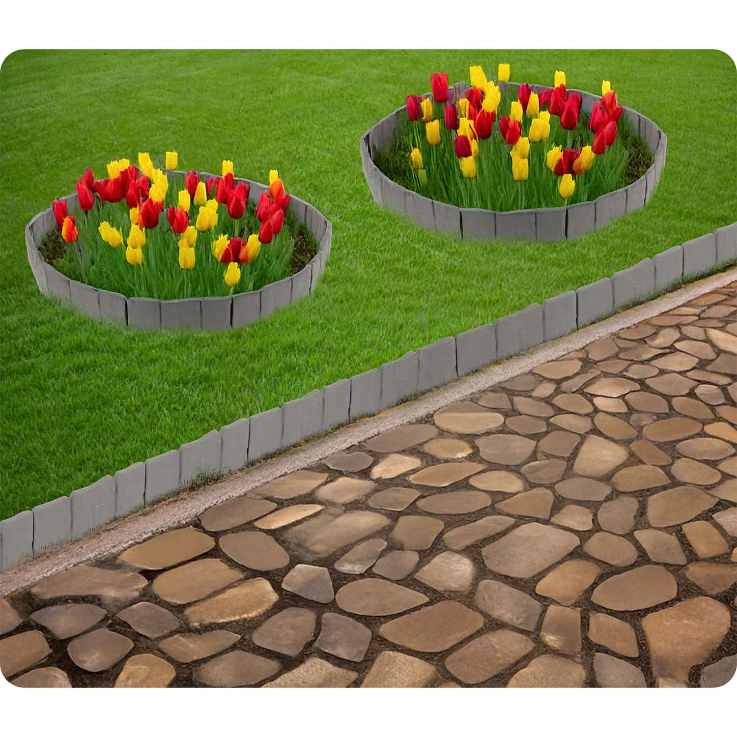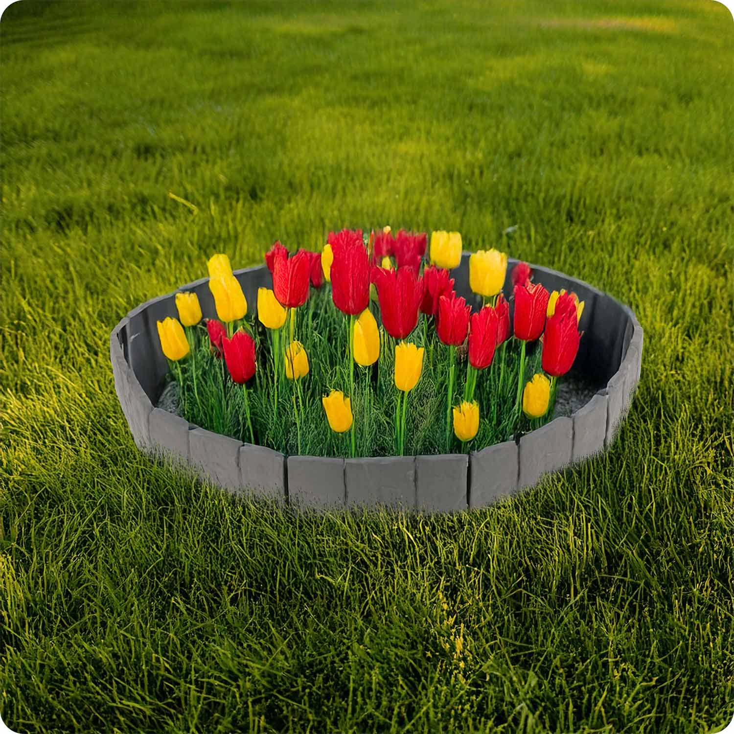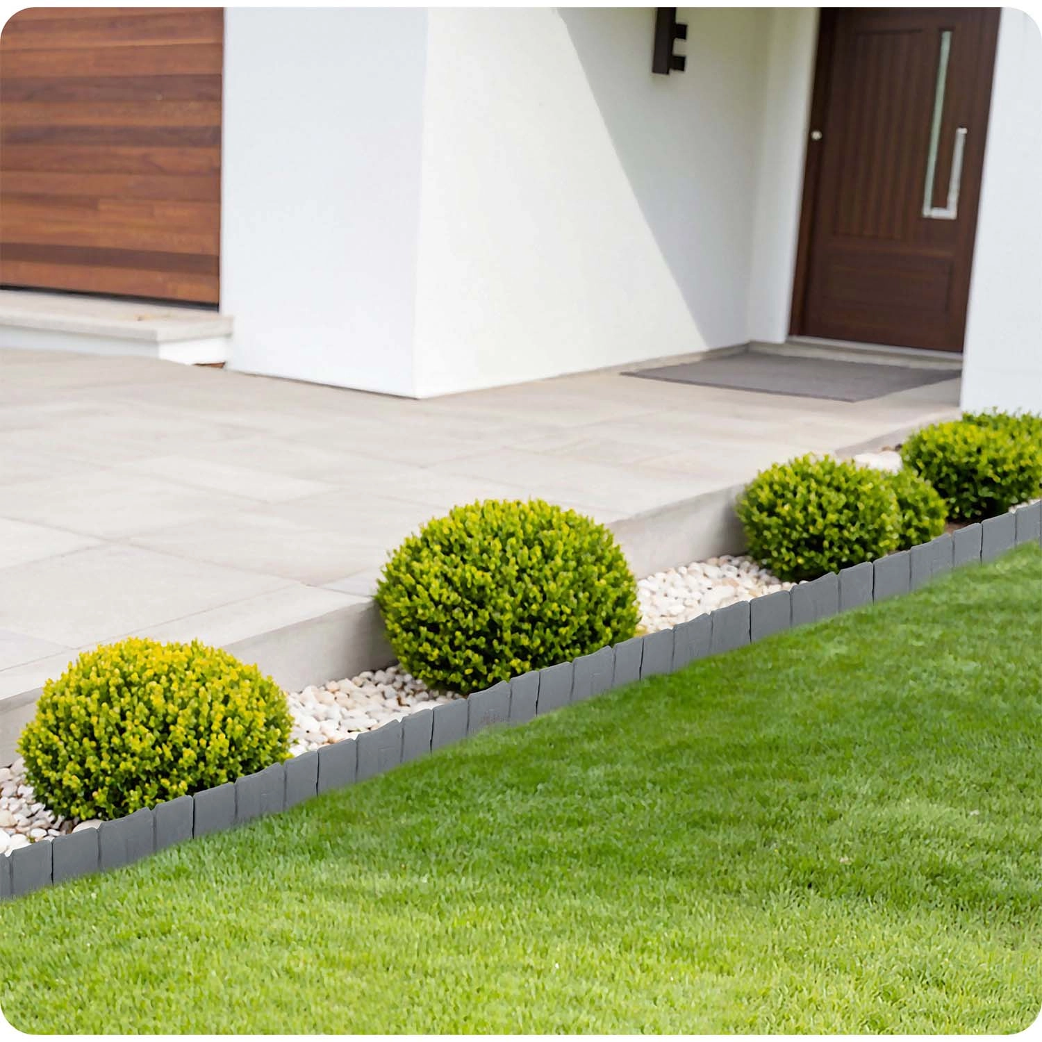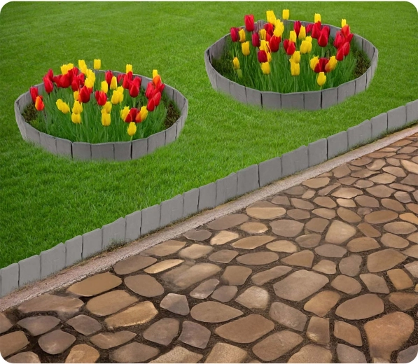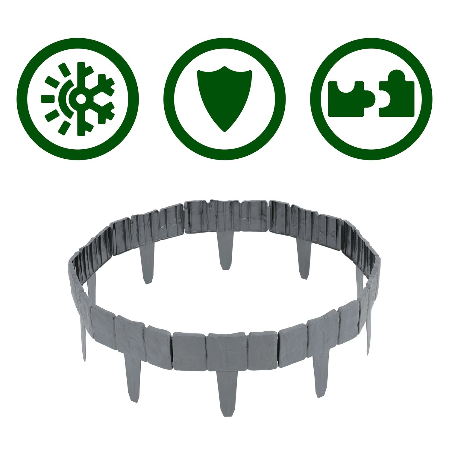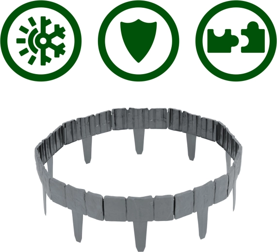Materiał PP zaprojektowano do użytku zewnętrznego: odporny na promieniowanie UV, mróz i deszcz, nie degraduje się i zachowuje kształt. Dodatkowo zapobiega mieszaniu się gleby, kamyków i kory z trawnikiem oraz pomaga utrzymać krawędzie rabat w czystości i estetyce.