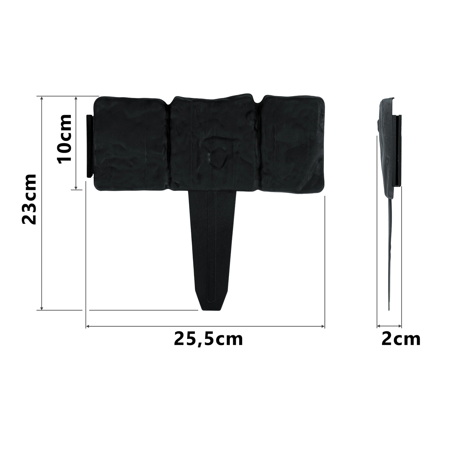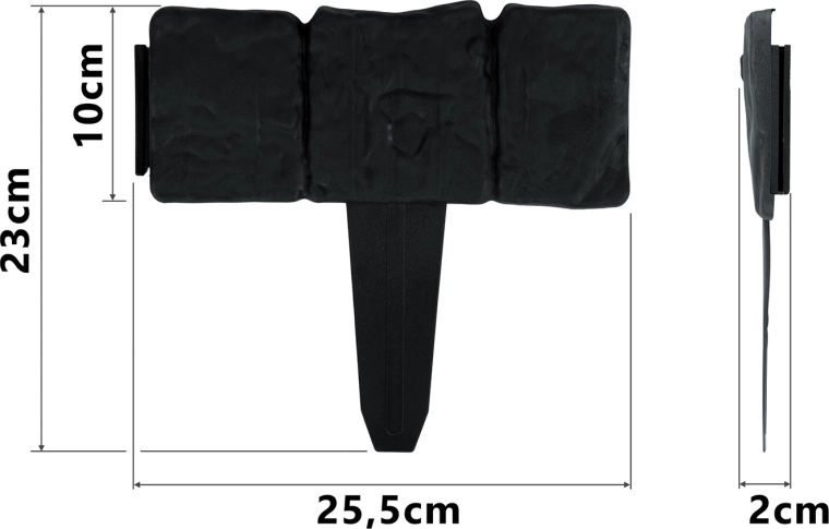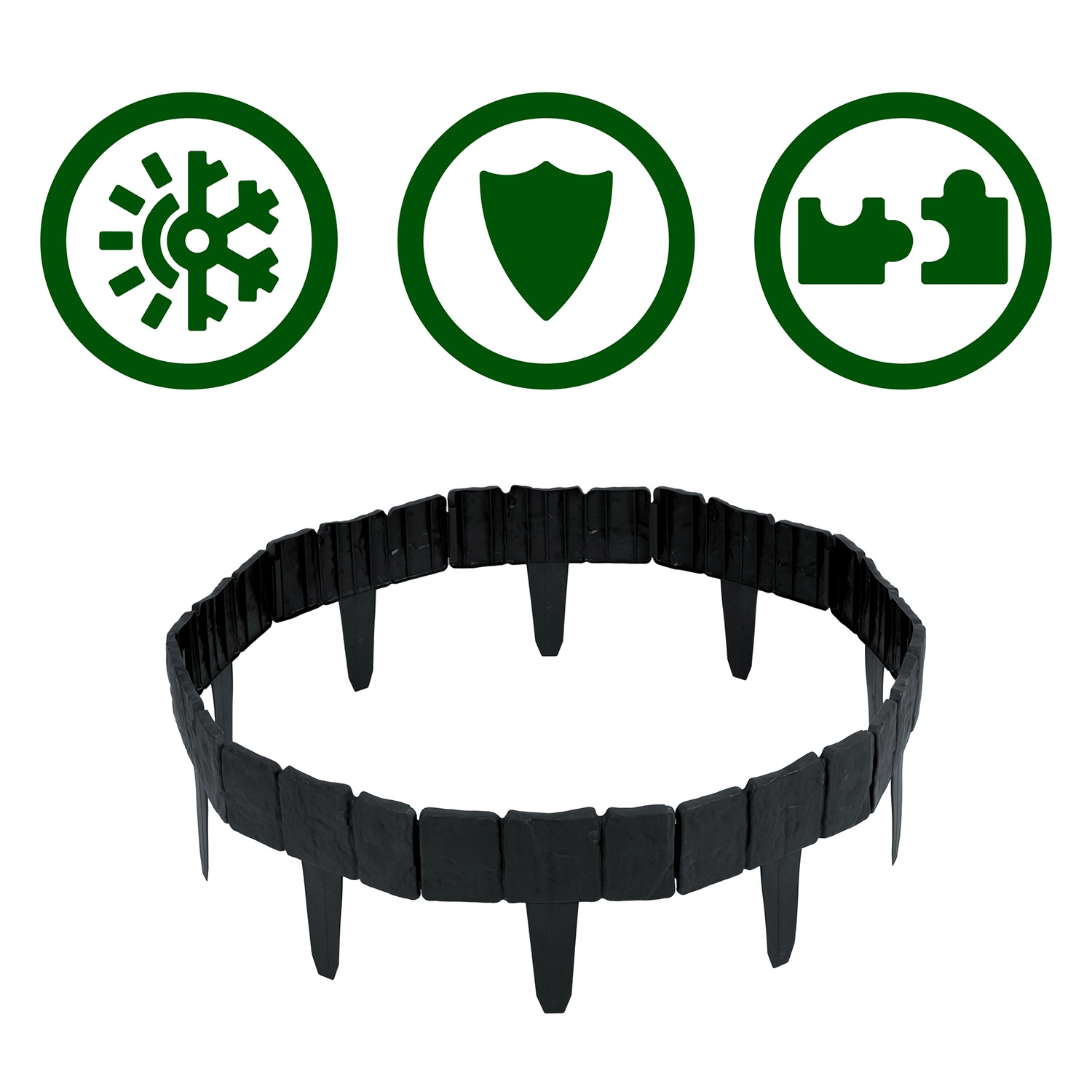 Zintegrowane kołki umożliwiają łatwe wbicie w glebę i stabilne mocowanie bez użycia narzędzi. Krawędź pozostaje równa i trzyma kształt nawet w wymagających warunkach.
