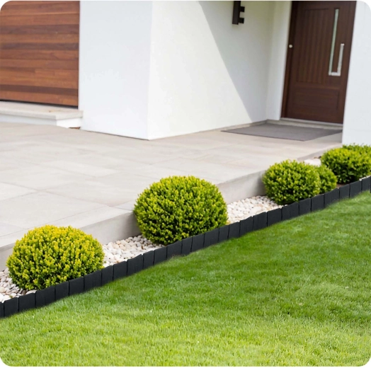 Dzięki modułowym segmentom ze zintegrowanymi kołkami łatwo ułożysz proste linie, łuki i okręgi. Szybki montaż bez specjalistycznych narzędzi oszczędza czas, a efekt jest czysty i estetyczny – obrzeże utrzymuje materiał na miejscu i zapobiega przerastaniu trawy na rabaty.
