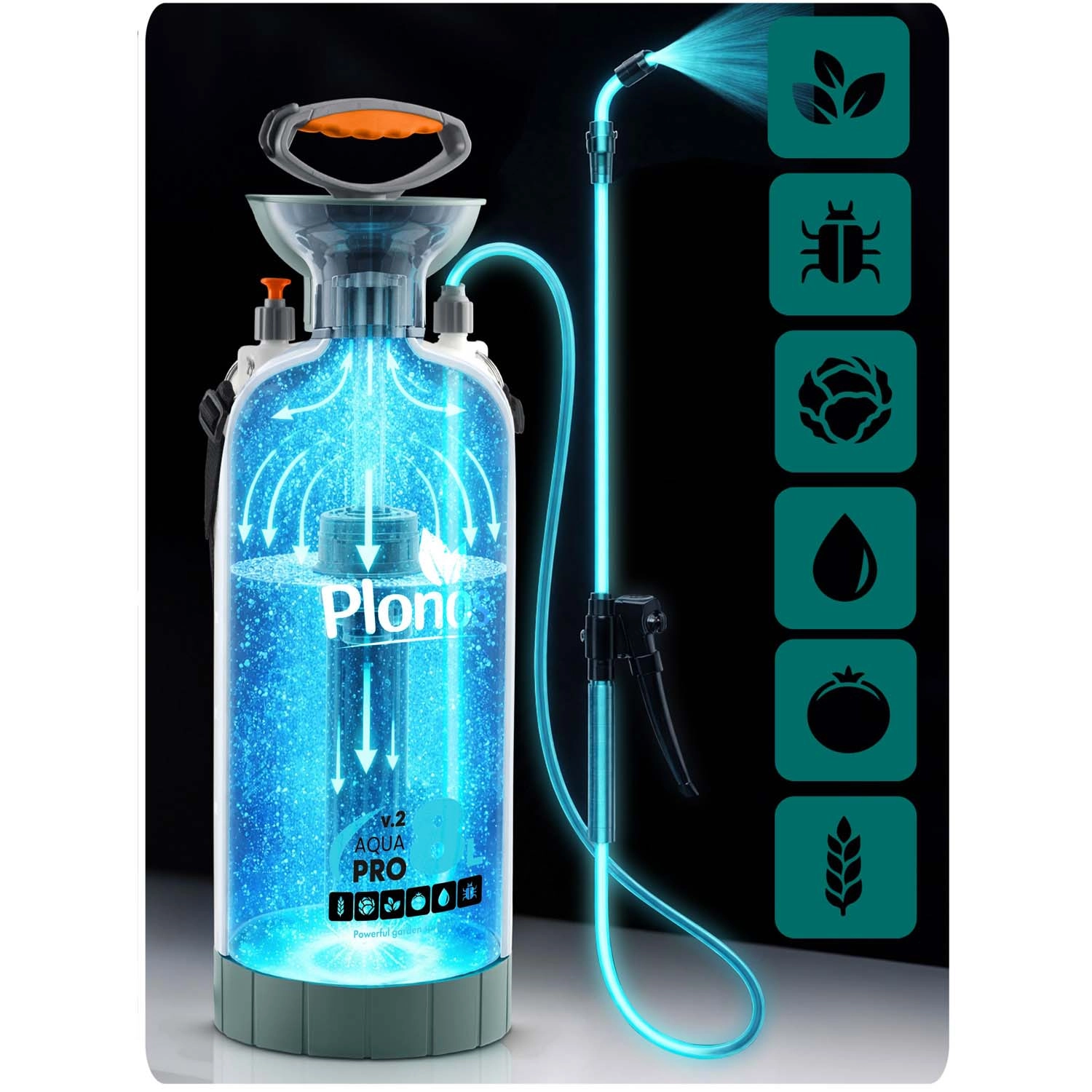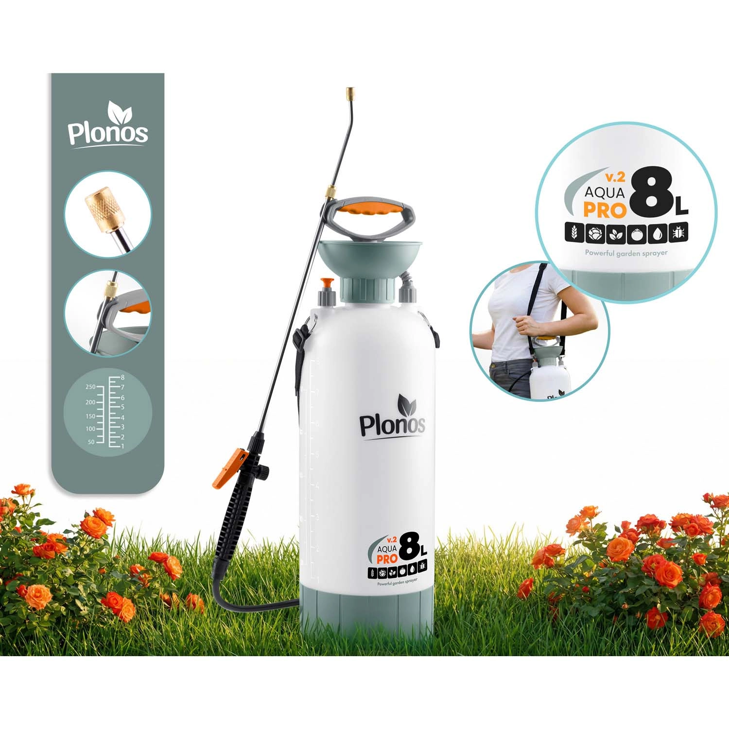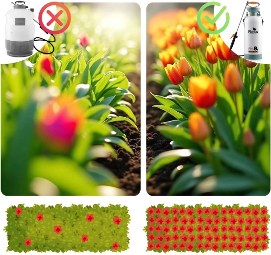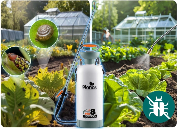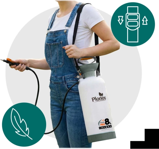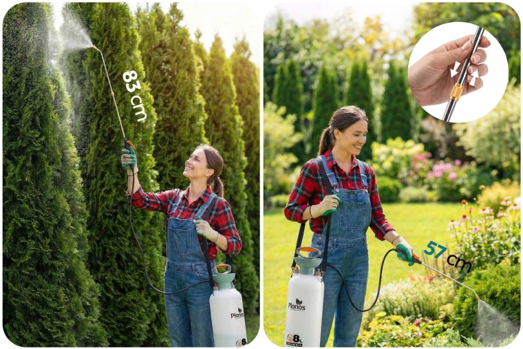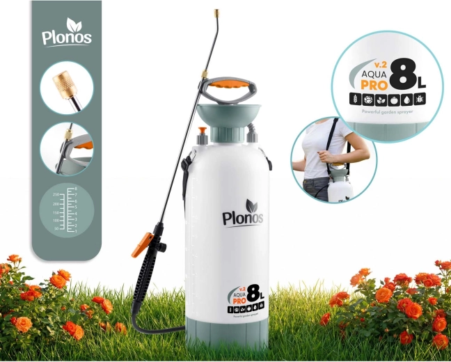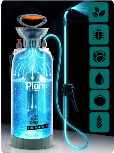 Spraw, by opryski, nawożenie i ochrona przed szkodnikami były szybkie i precyzyjne. Opryskiwacz Plonos o pojemności 8 litrów ma precyzyjną mosiężną dyszę i nierdzewną lancę, które są odporne na chemię i umożliwiają płynną regulację od mgiełki po strumień. Kontrolowane ciśnienie 2,76 bar utrzymuje równomierne rozproszenie kropel dla efektywnego pokrycia liści i kwiatów.