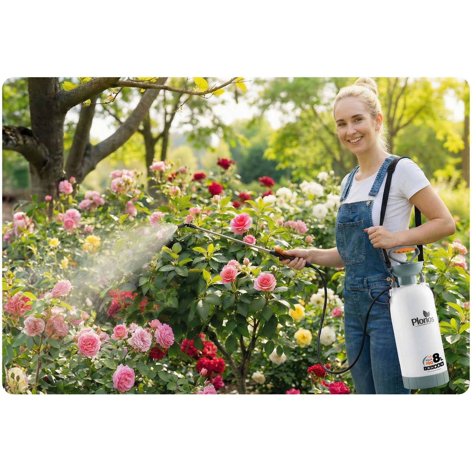 Długa lanca i spust z precyzyjną regulacją umożliwiają równomierny oprysk róż, krzewów i rabat bez schylania i wysiłku.