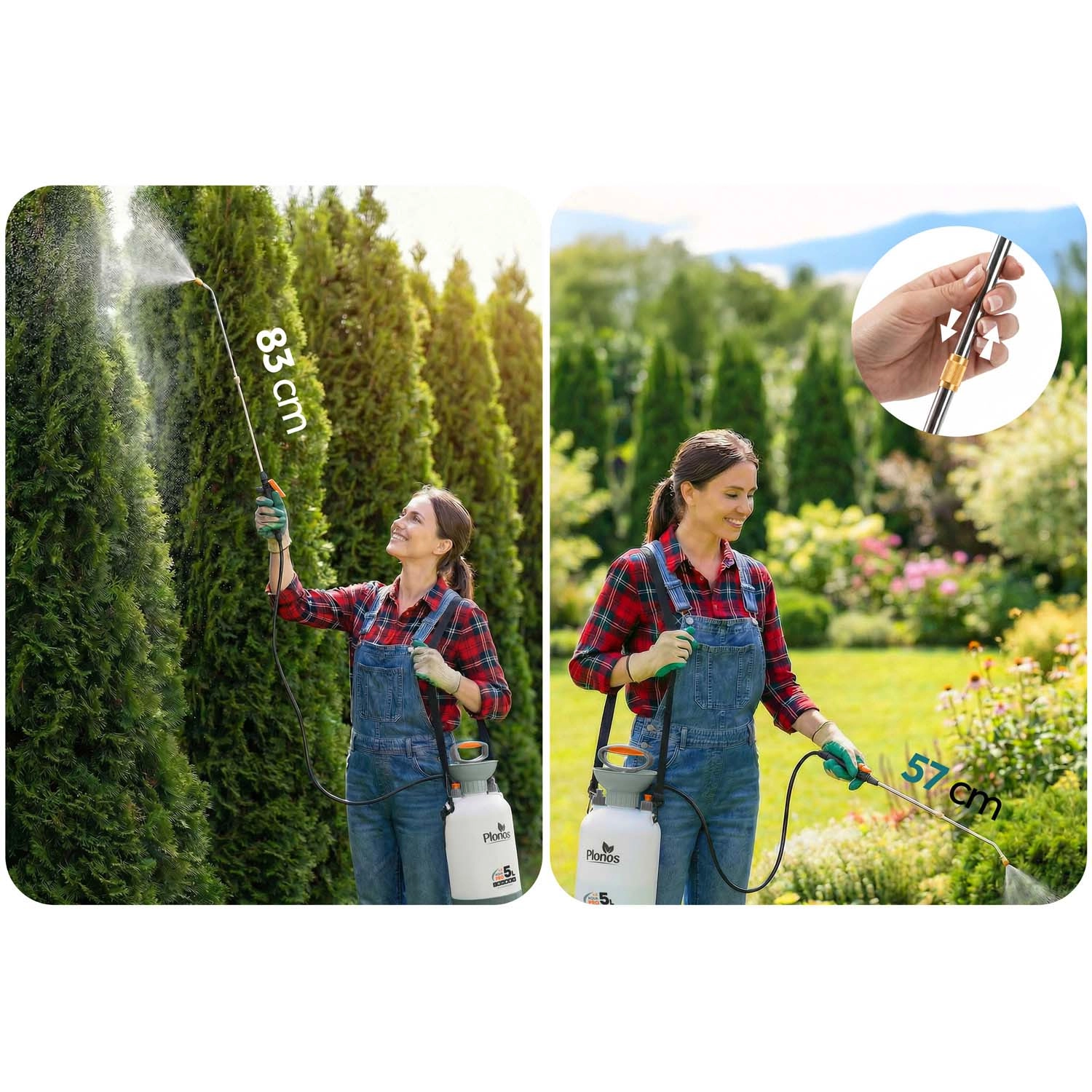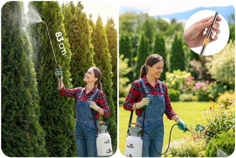 Opryskiwacz zapewnia kontrolowane i równomierne rozpylenie przy ciśnieniu do 2,76 bar oraz płynnej regulacji przepływu – od delikatnej mgiełki po silny strumień. Teleskopowa lanca o długości 57–83 cm pozwoli wygodnie dosięgnąć krzewów i trudno dostępnych miejsc bez zbędnego schylania. Doskonały wybór do zraszania, aplikacji nawozów i ochrony roślin przed szkodnikami.