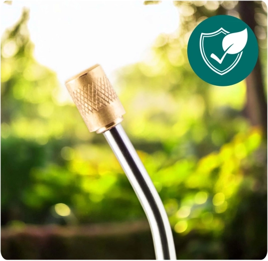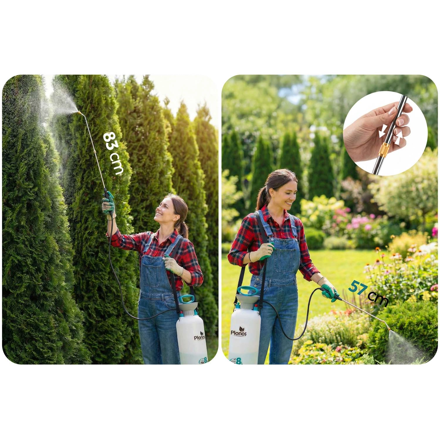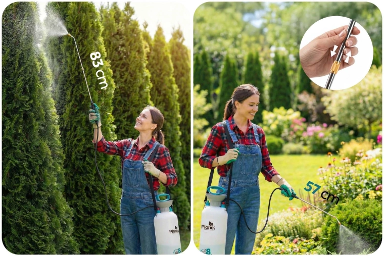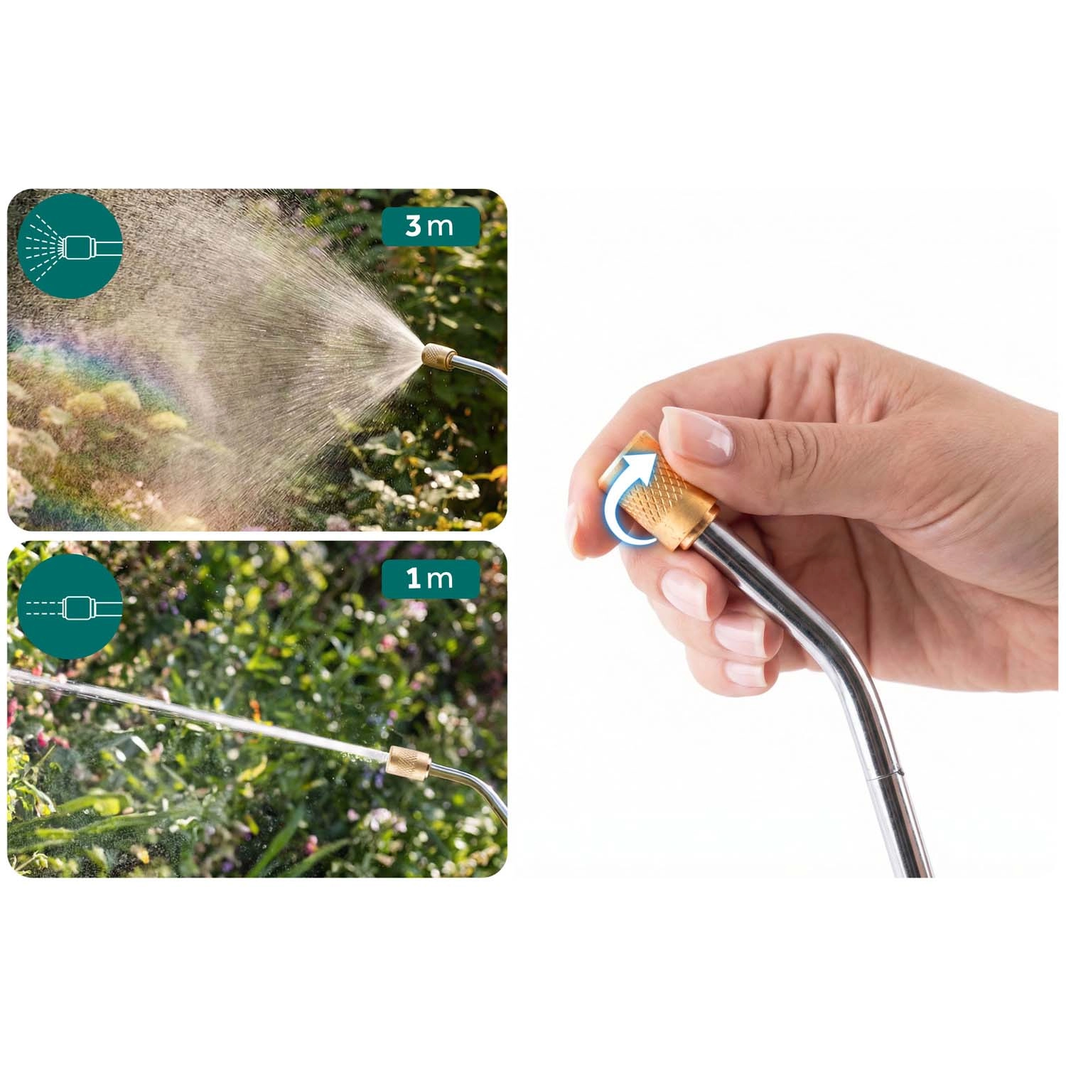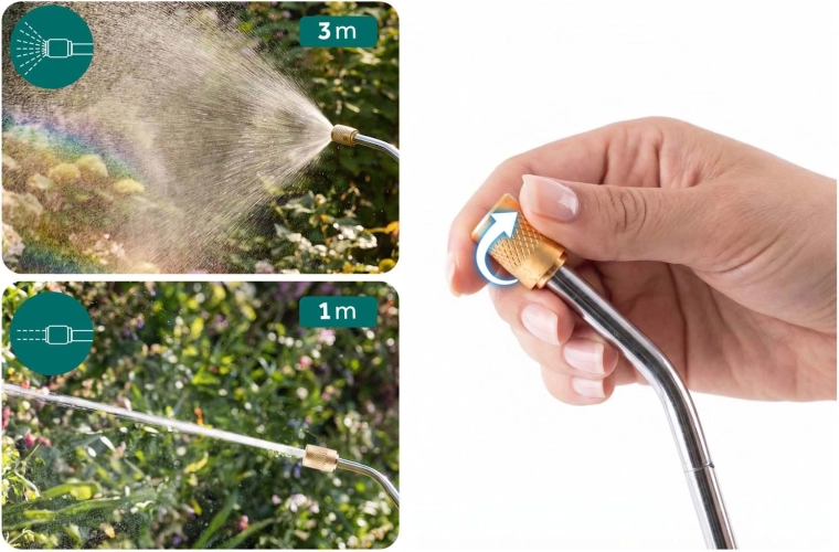 Praktyczna regulowana lanca (57–83 cm) zwiększa zasięg bez schylania się i umożliwia łatwe celowanie nawet w trudniej dostępne miejsca. Mosiężna dysza z płynną regulacją przełącza się od delikatnej mgiełki do ciągłego strumienia jednym obrotem. Lejek wlotowy ułatwia czyste napełnianie bez rozlewania, a wzmocniony pasek na ramię podnosi komfort podczas dłuższej pracy.