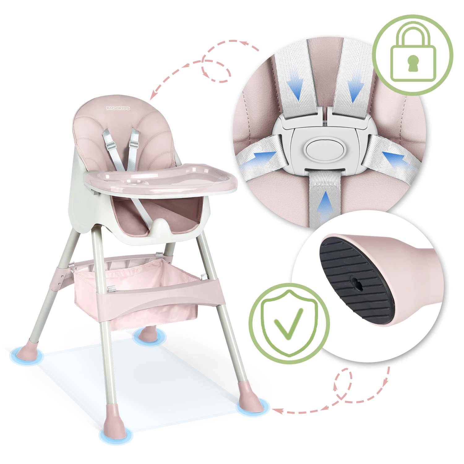 5‑punktowe pasy, antypoślizgowe stopki i solidna podstawa zapewniają stabilne i bezpieczne siedzenie podczas jedzenia i zabawy.