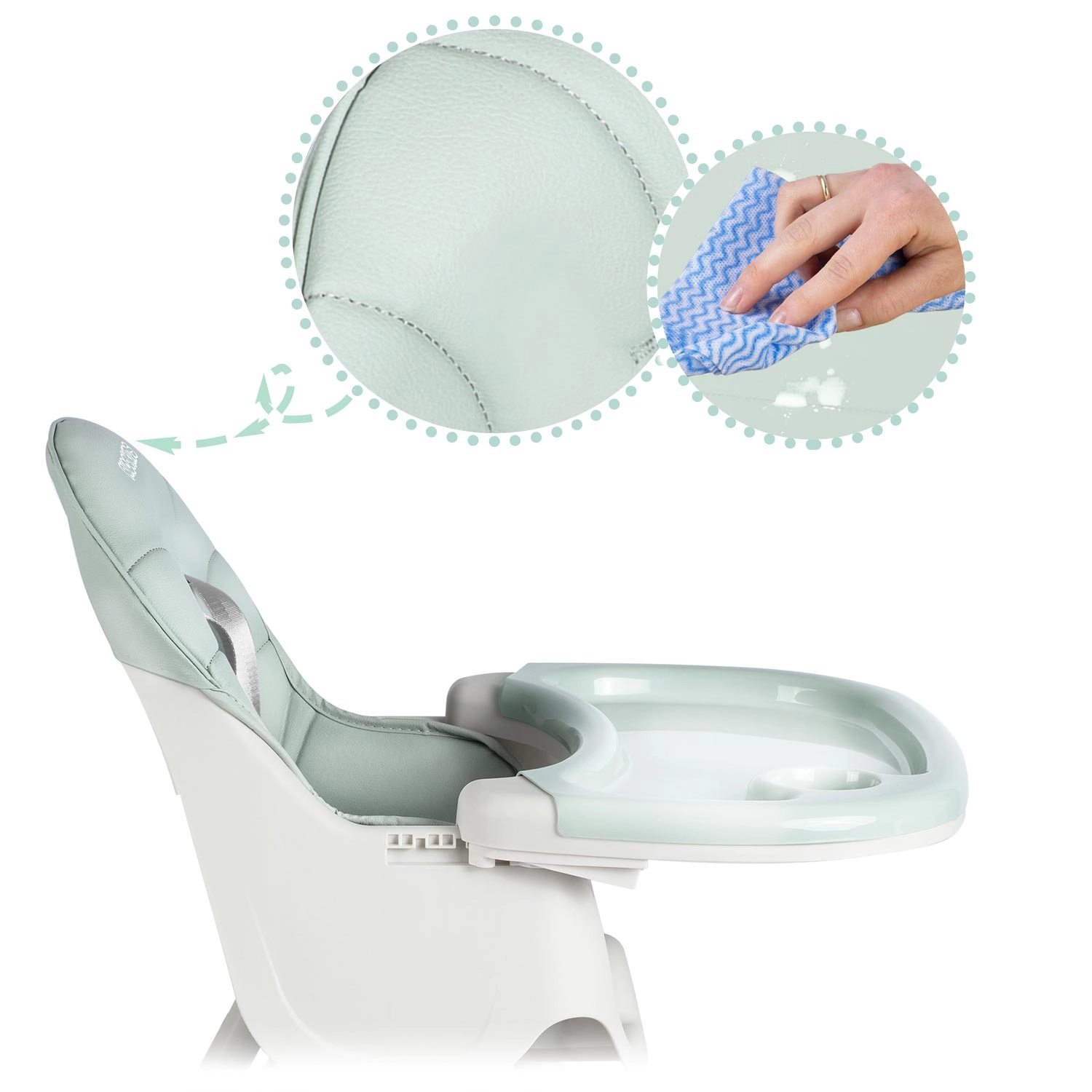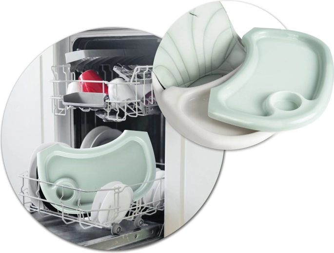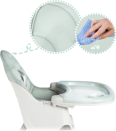 Taca z podwyższonymi krawędziami zatrzymuje rozlania, a odpinaną wkładkę łatwo opłuczesz lub umyjesz w zmywarce. Siedzisko wystarczy przetrzeć wilgotną ściereczką.