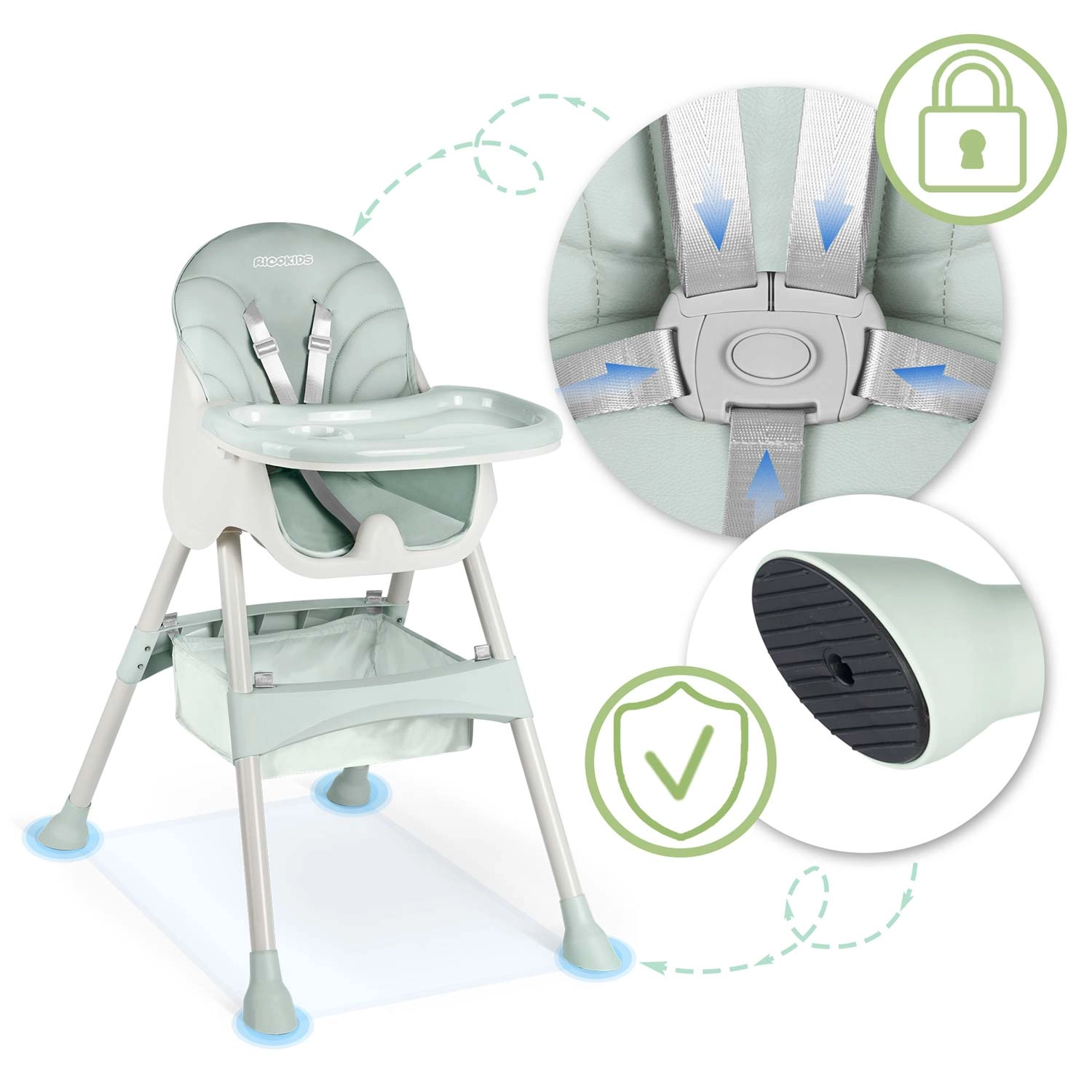 • Stabilność i bezpieczeństwo: 5‑punktowe pasy, antypoślizgowe końcówki nóg.