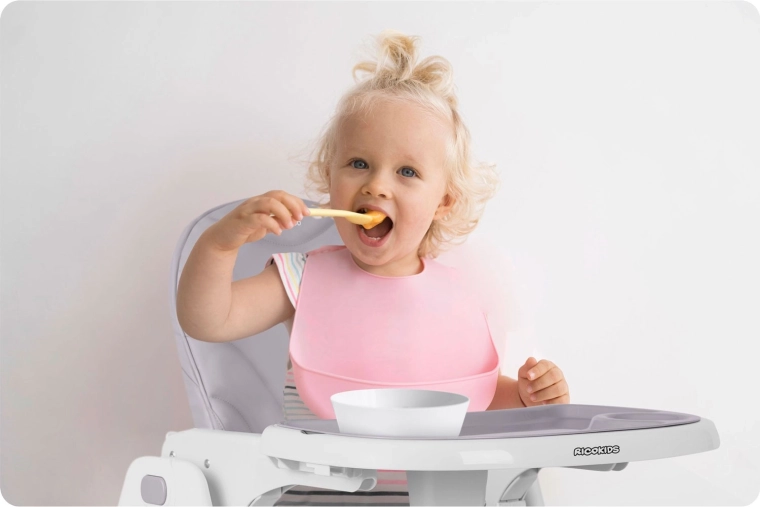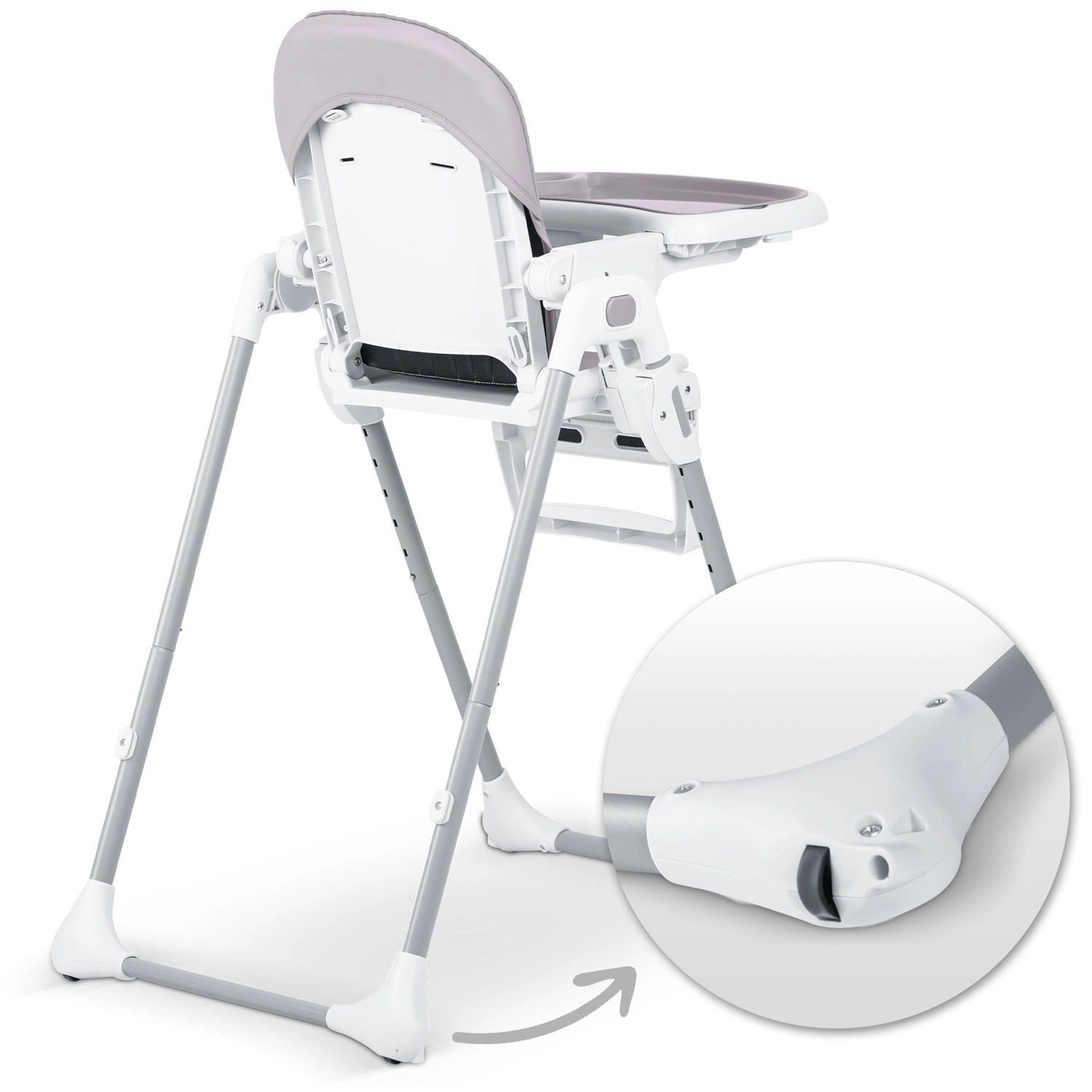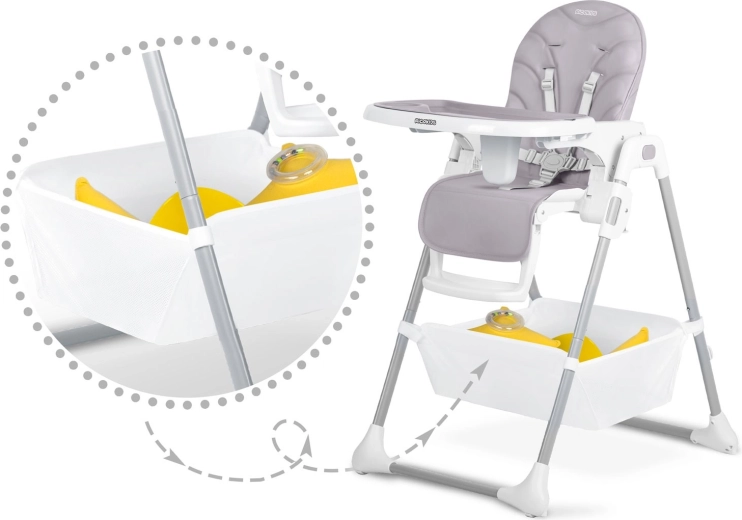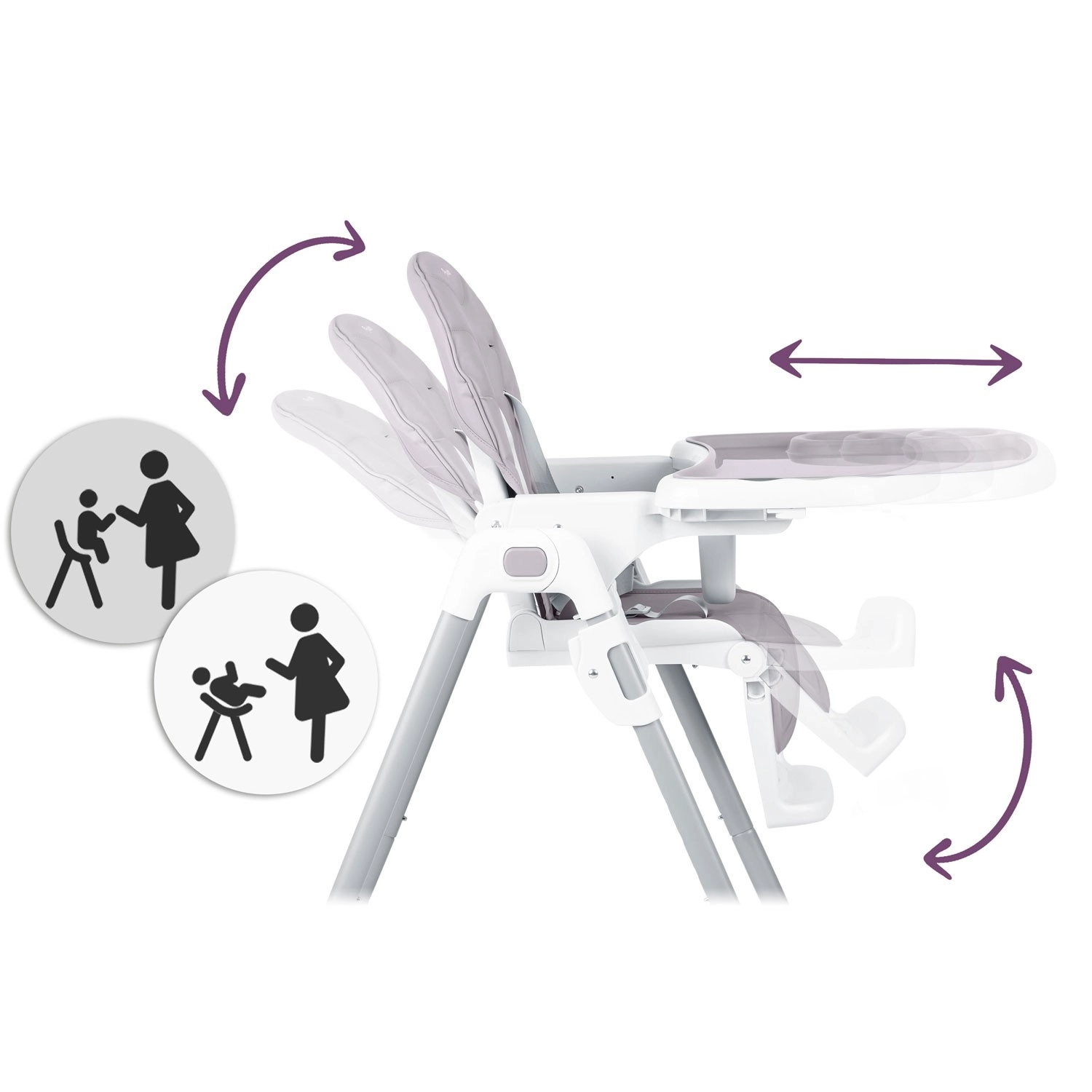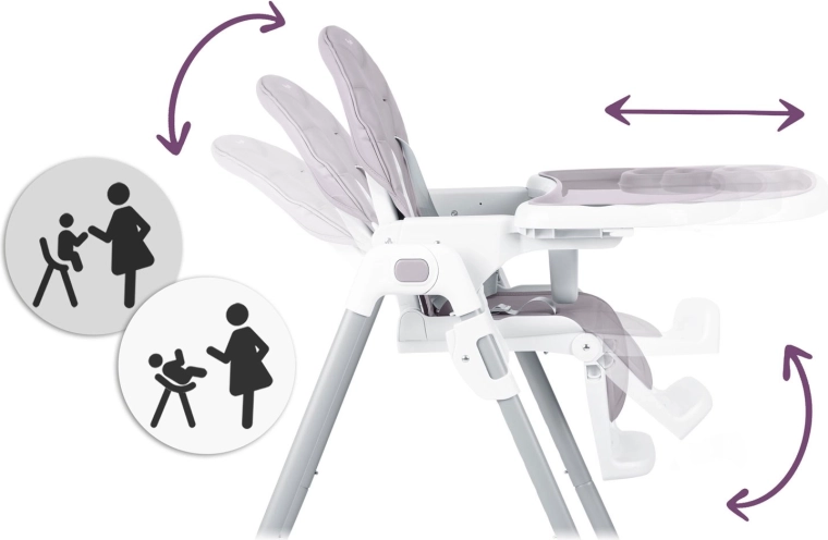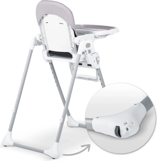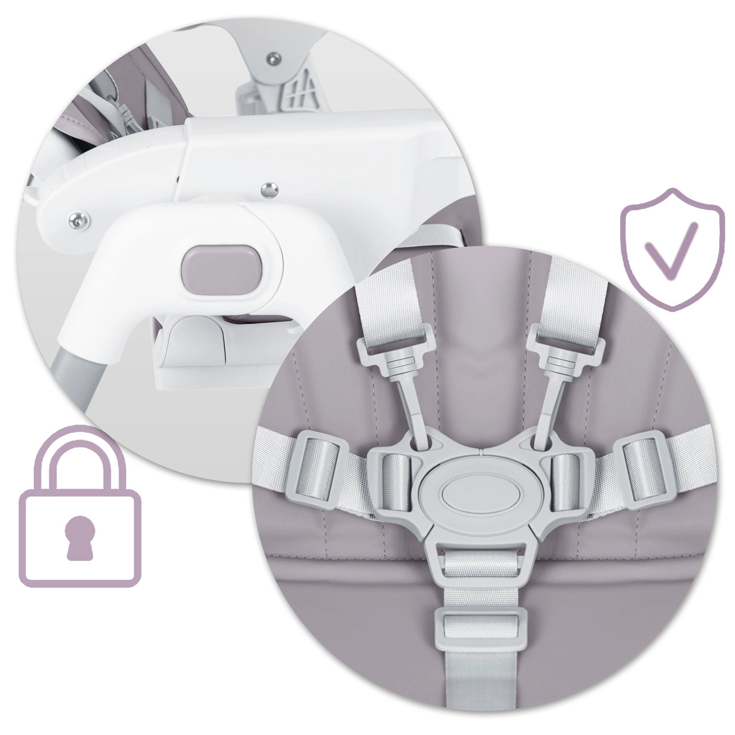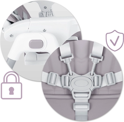 Pięciopunktowe pasy bezpieczeństwa i stabilna rama zapewniają bezpieczne siedzenie dziecka podczas jedzenia i zabawy. Regulacje i blokady są łatwo dostępne i niezawodne.