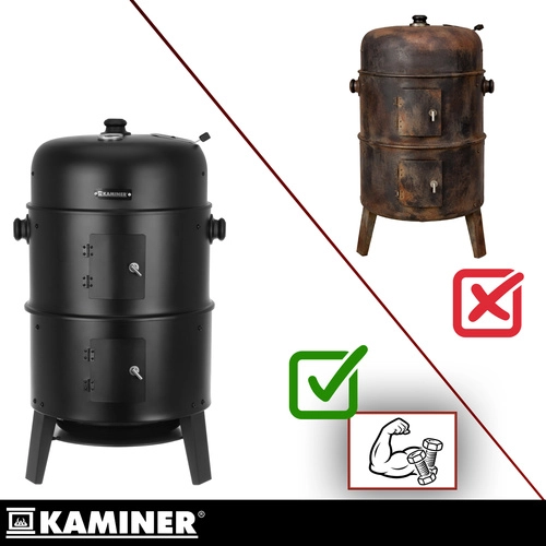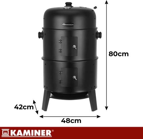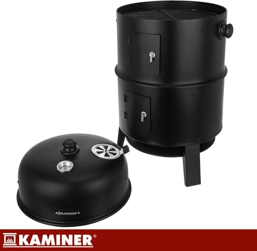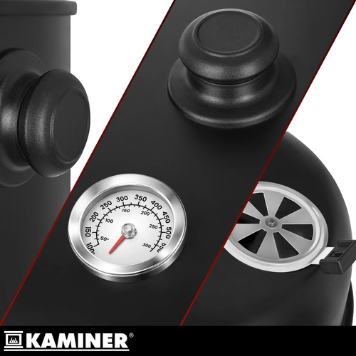 Odkryj uniwersalny grill KAMINER 3w1, który łączy grillowanie, wędzenie i palenisko w jednym. Dzięki termometrowi w pokrywie, regulacji dopływu powietrza oraz dwóm chromowanym rusztom 38 cm przygotujesz soczyste steki i aromatyczne wędliny przy minimalnym wysiłku. 8 haczyków do wędzenia, wytrzymała stalowa konstrukcja 0,9 mm i łatwe czyszczenie czynią z niego idealny wybór na każde BBQ.