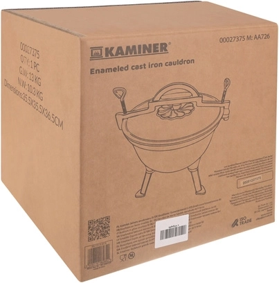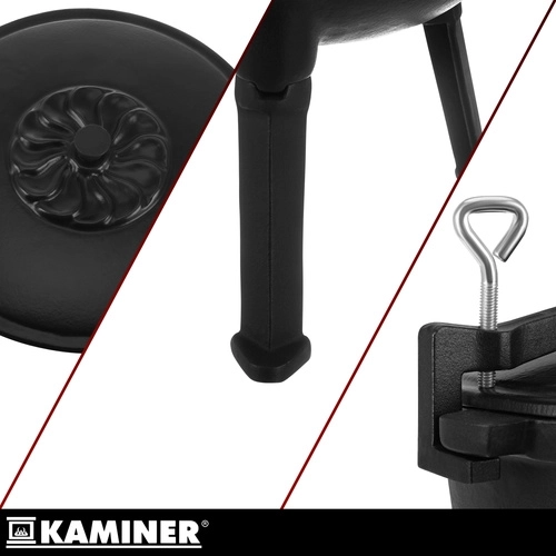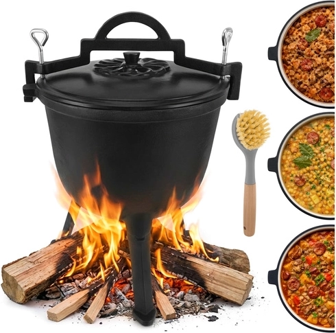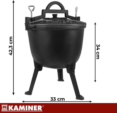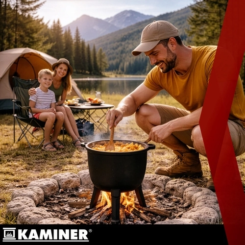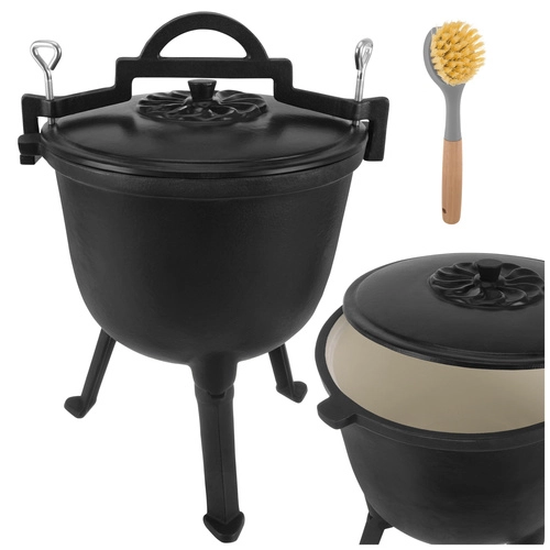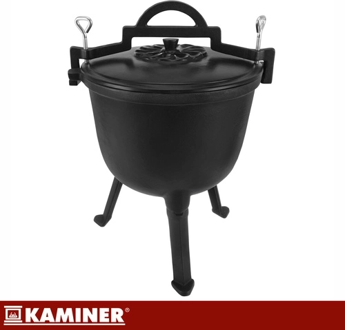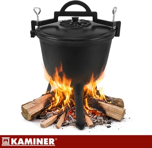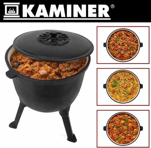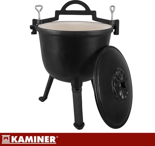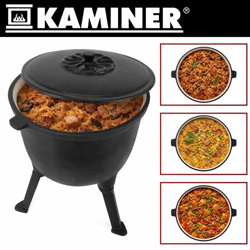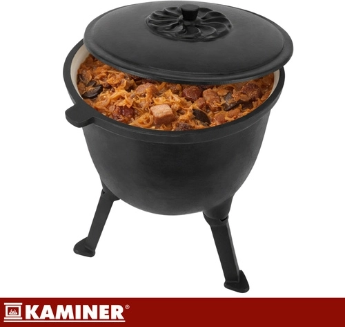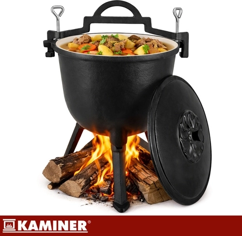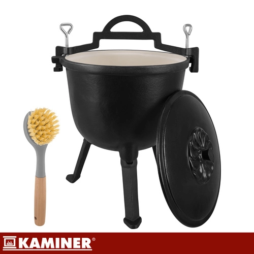 Solidny żeliwny kociołek o pojemności 8 l marki KAMINER jest idealny do gotowania na zewnątrz nad ogniem. Dzięki równomiernemu rozprowadzaniu ciepła i emaliowanemu wnętrzu potrawy się nie przypalają, a czyszczenie jest łatwe. Odkręcane nóżki zapewniają stabilność w palenisku, pokrywa z uchwytem utrzymuje ciepło, a praktyczna górna klamra umożliwia przenoszenie i zawieszenie nad żarem. W zestawie znajduje się również szczotka czyszcząca.