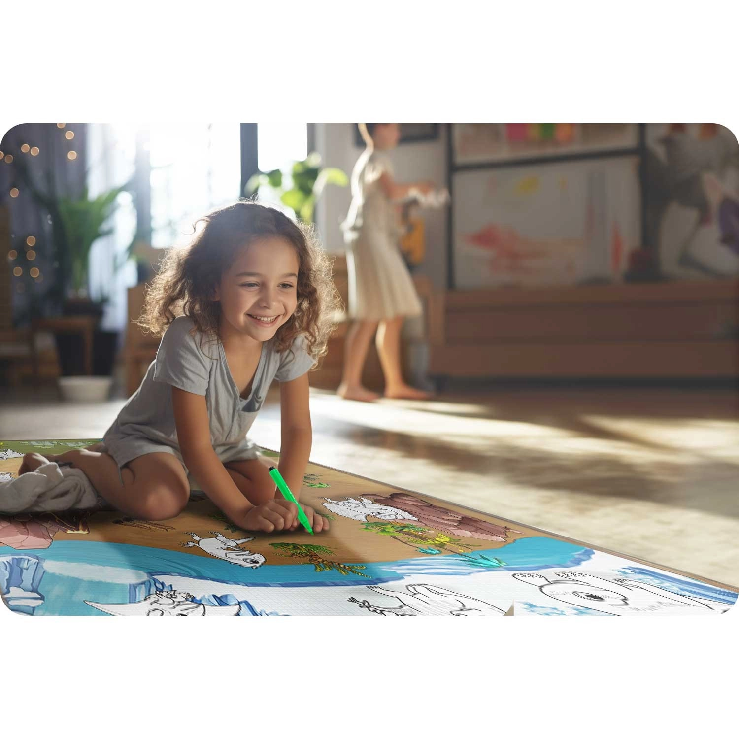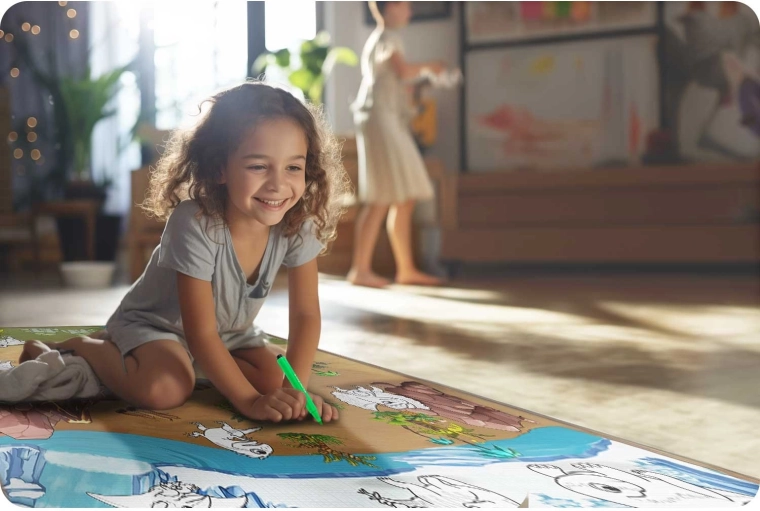 Stwórz dzieciom kreatywną strefę w domu i na zewnątrz. Wielkoformatowa mata do kolorowania z pianki EVA jest miękka, przyjemna w dotyku i chroni przed chłodem podłogi. Specjalna powierzchnia umożliwia rysowanie zwykłymi pisakami – kolory szybko schną, nie odbijają się na dłoniach i łatwo je zetrzeć wilgotną ściereczką.