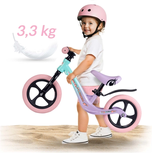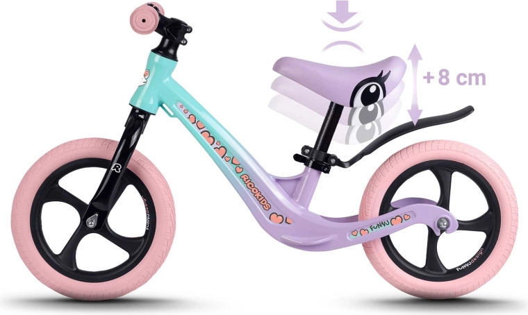 Lekki dziecięcy rowerek biegowy Ricokids Funnu jest idealny na pierwsze jazdy bez pedałów. Dzięki magnezowej ramie jest wytrzymały, a jednocześnie lekki, ma regulowaną wysokość siodełka, nieprzebijalne koła 12'' z EVA oraz gumowe, zakończone odbojnikami gripy dla bezpiecznego chwytu. Pomaga dzieciom rozwijać równowagę i koordynację oraz przygotowuje do klasycznego roweru.
