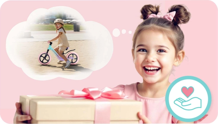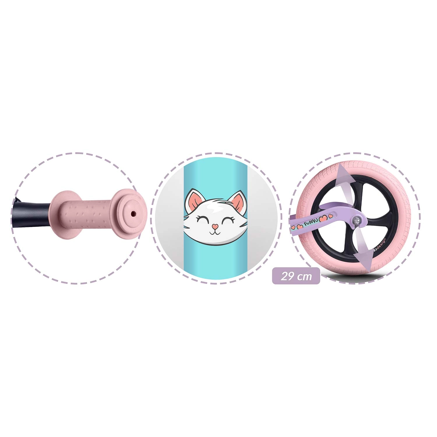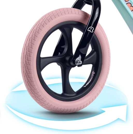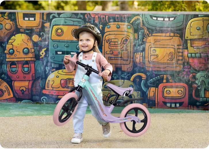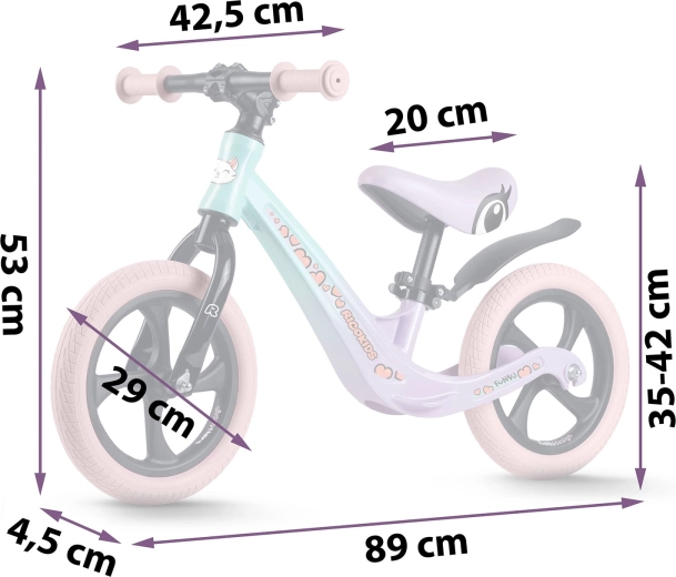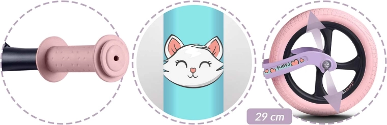 Ergonomiczne miękkie piankowe siodełko z płynną regulacją wysokości (ok. 35–42 cm) rośnie razem z dzieckiem i zapewnia komfort podczas każdej jazdy. Gumowe gripy z odbojnikami dają pewność i kontrolę nad kierownicą, a szeroka kierownica i stabilny rozstaw osi wspierają naturalną naukę równowagi.