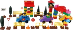 Zestaw zawiera realistyczne elementy, które symulują środowisko ruchu do zabawy, takie jak samochody, drzewa i znaki drogowe.