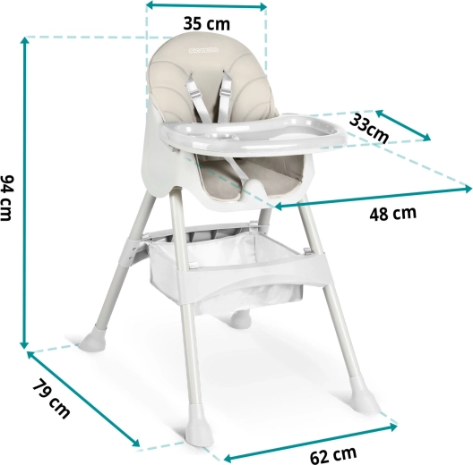 Bezpieczeństwo na pierwszym miejscu: 5‑punktowe pasy, antypoślizgowe końcówki nóg oraz konstrukcja spełniająca europejską normę EN 14988 zapewniają pewność podczas posiłków i zabawy. Miękka tapicerka wykonana jest z materiału, który nie wchłania zabrudzeń – wystarczy przetrzeć wilgotną ściereczką. W zestawie znajduje się także kosz na zabawki i akcesoria oraz silikonowy śliniak gratis.