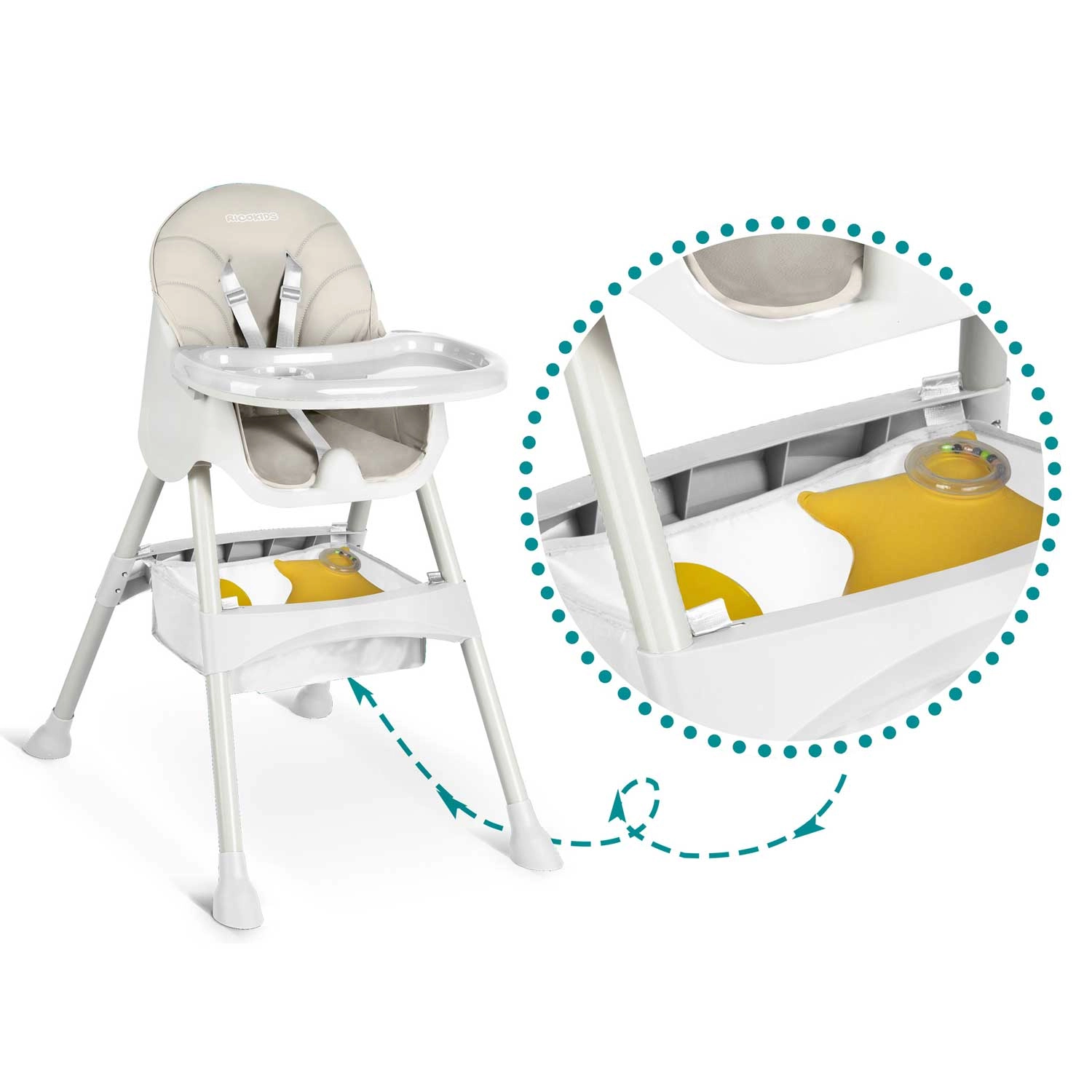 RICOKIDS Milo to lekkie i wygodne krzesełko do karmienia, które łatwo dopasowuje się do bieżących potrzeb – sprawdzi się jako wysokie krzesełko przy stole oraz jako niskie siedzisko dla starszego dziecka. Dzięki kompaktowemu składaniu szybko je przechowasz, a odpinany stolik z wkładką i podwyższonymi krawędziami ułatwia karmienie i sprzątanie.