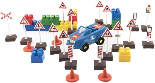 Zestaw edukacyjny Nauka Jazdy oferuje zabawę oraz edukację w jednym! Zawiera 16 sztuk znaków drogowych, 2 pachołki i samochód, co jest idealne dla rozwoju umiejętności dzieci.