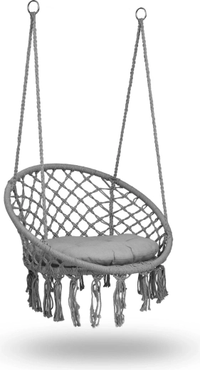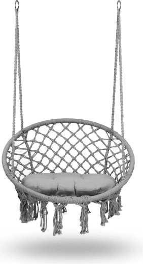 Wiszący fotel w nowoczesnym stylu boho łączy komfort i styl w każdym wnętrzu i na zewnątrz. Ergonomicznie ukształtowane siedzisko o szerokiej średnicy i wyższym oparciu wspiera ciało, a miękka, dopasowana poduszka zwiększa wygodę podczas czytania, relaksu i delikatnego bujania.