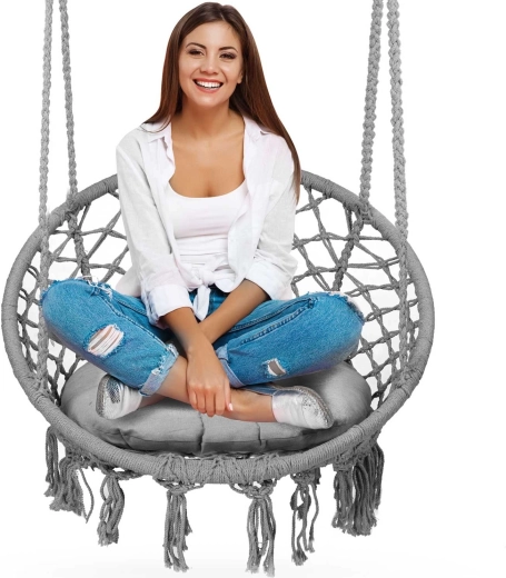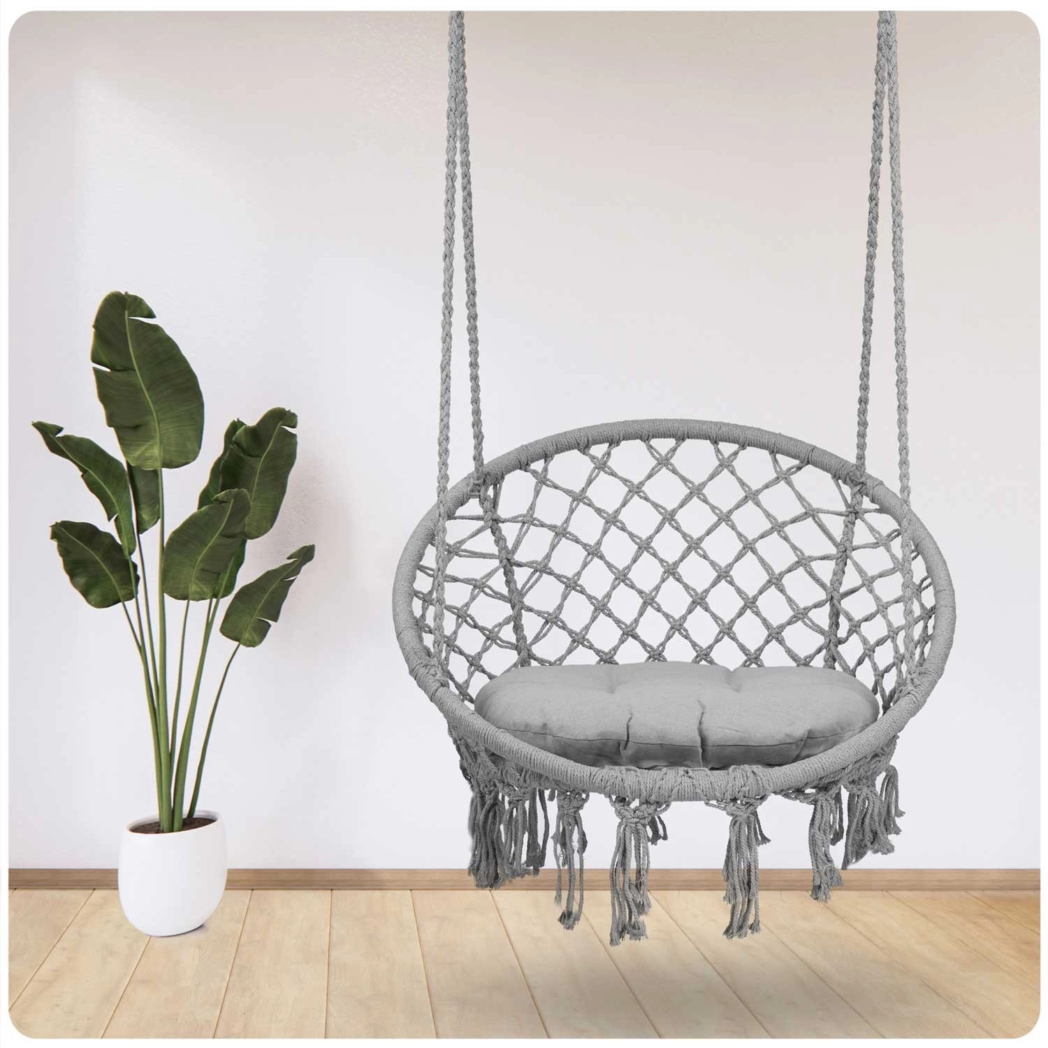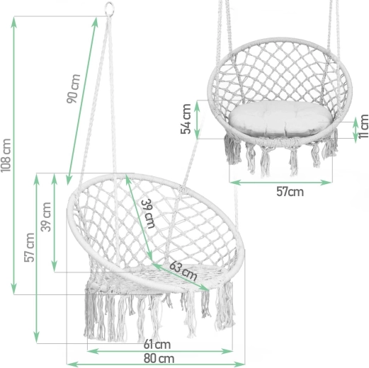 Metalowe obręcze, gęsty splot makramy i podwójnie plecione liny zapewniają stabilność, trwałość i udźwig do 150 kg.