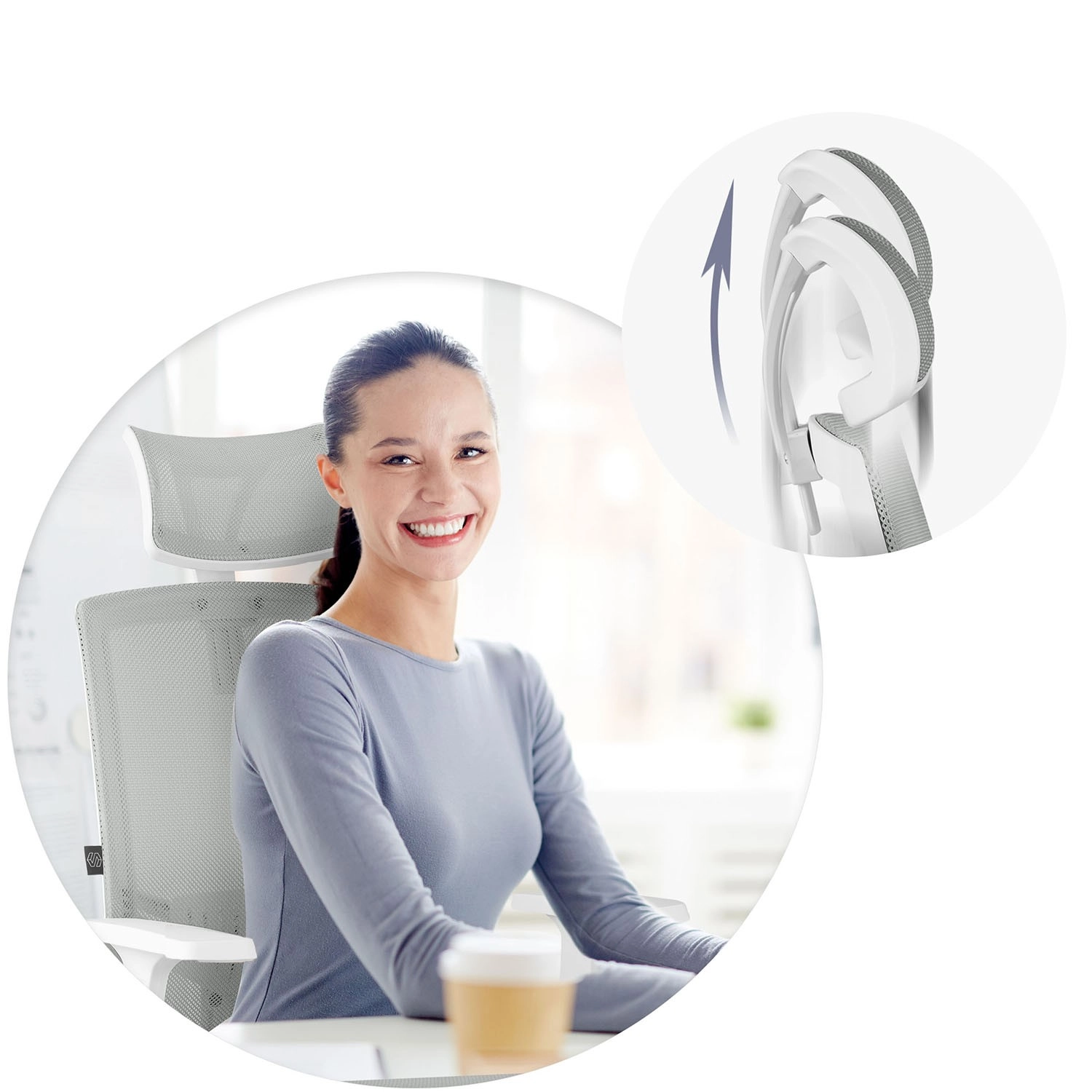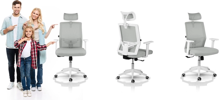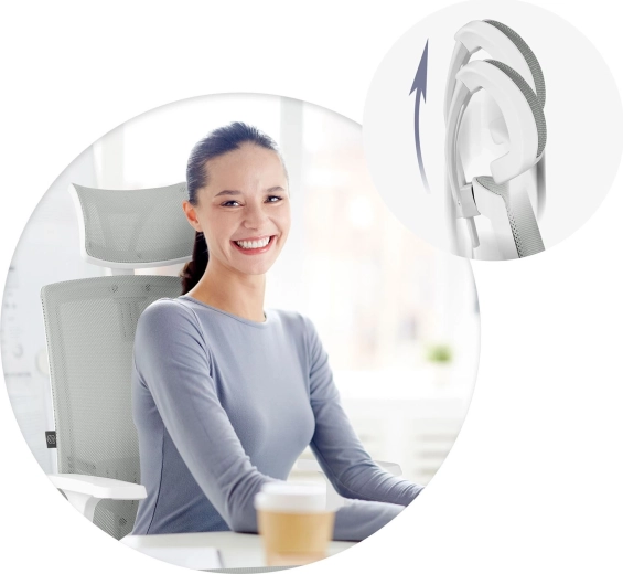 Wysokie oparcie z regulowanym na wysokość zagłówkiem odciąża odcinek szyjny kręgosłupa i wspiera prawidłową postawę ciała.