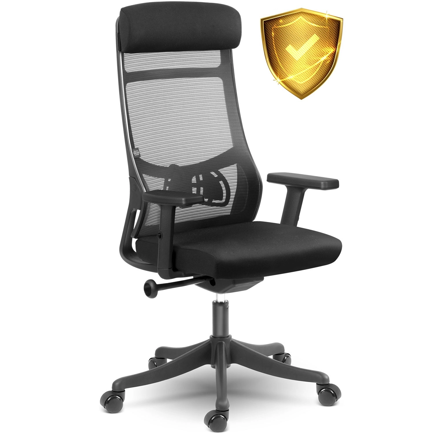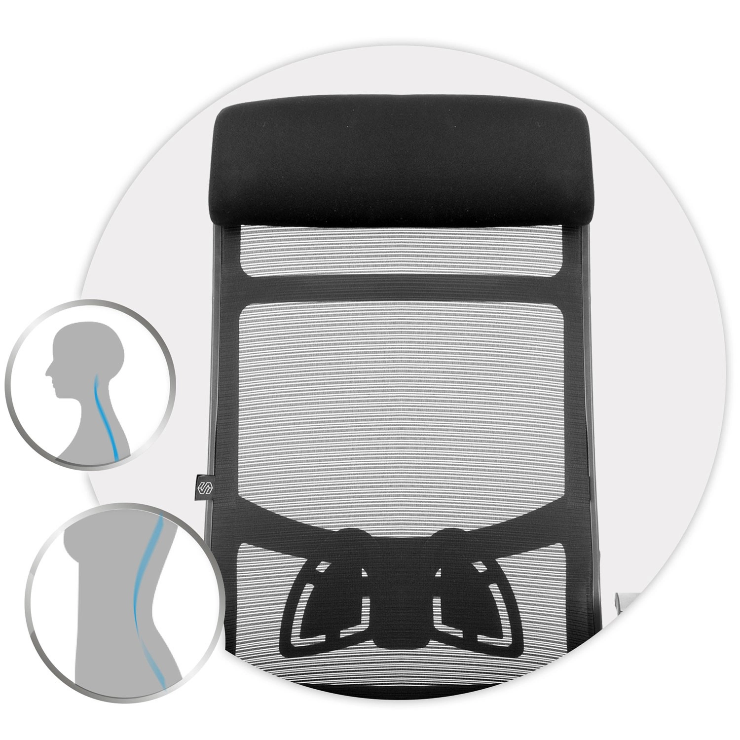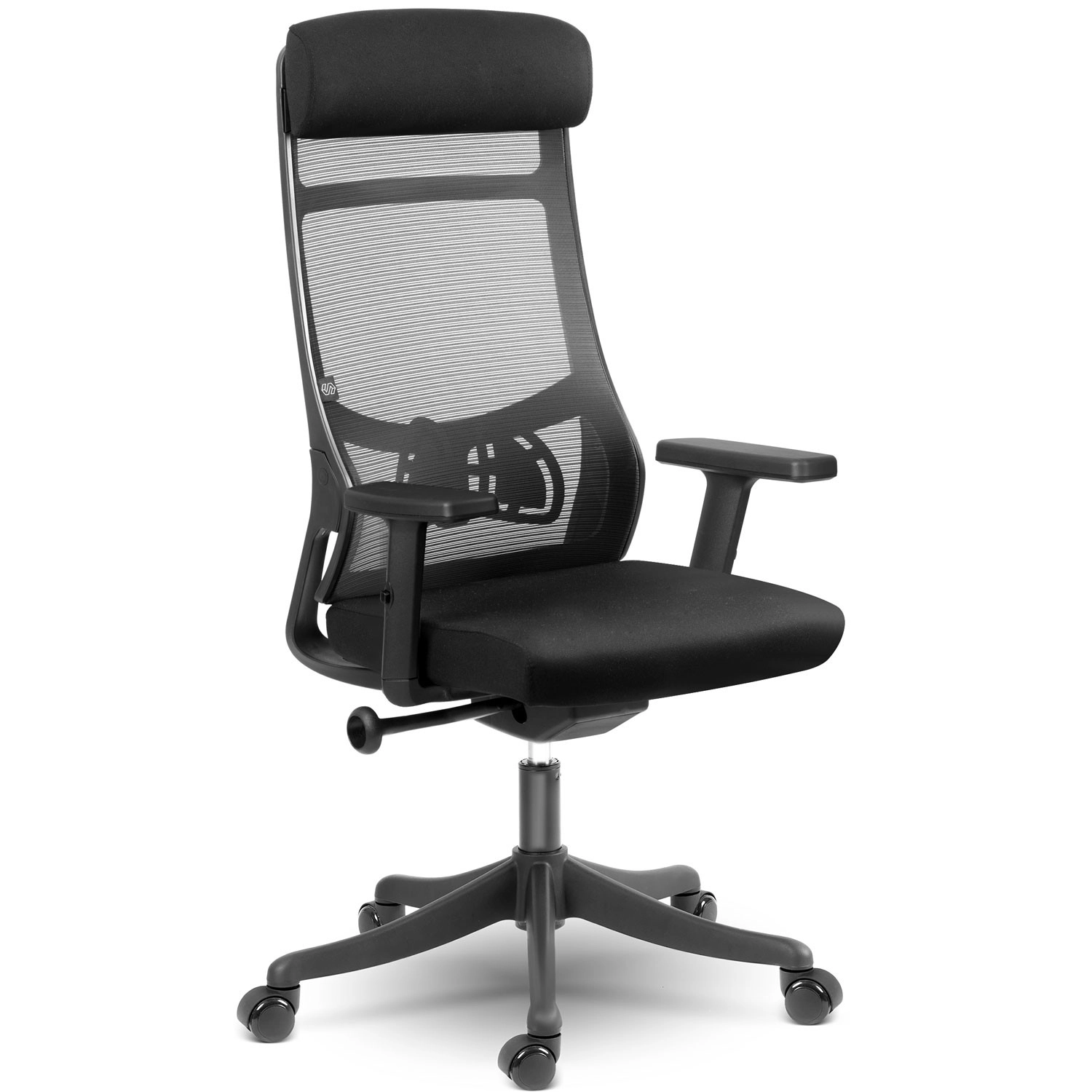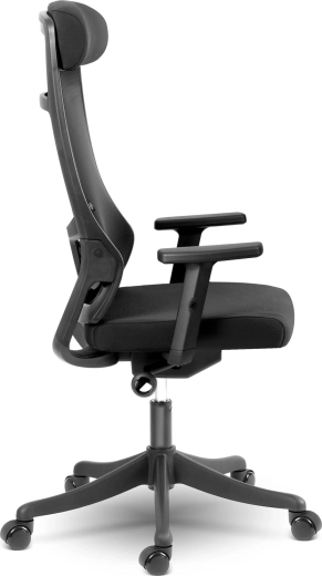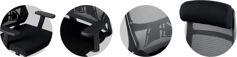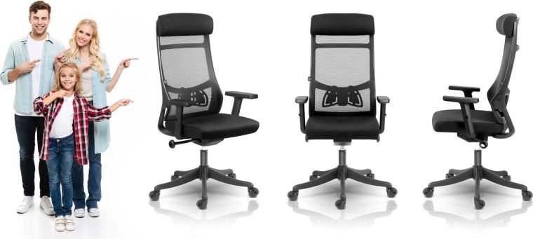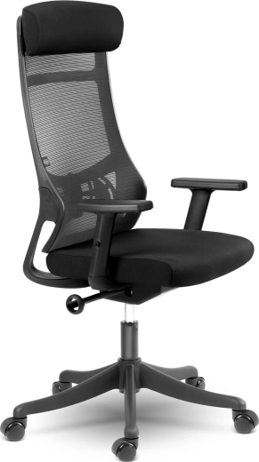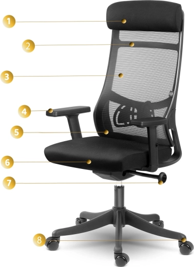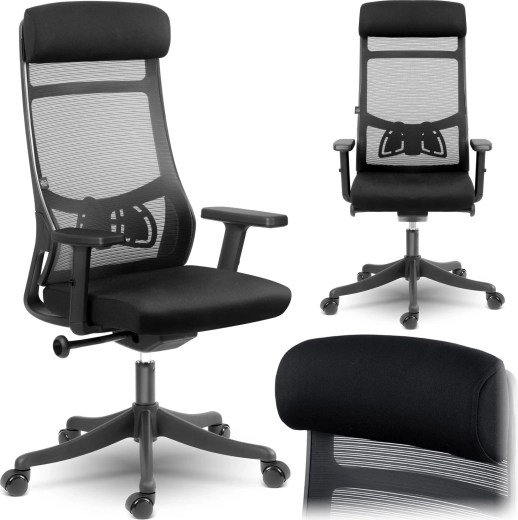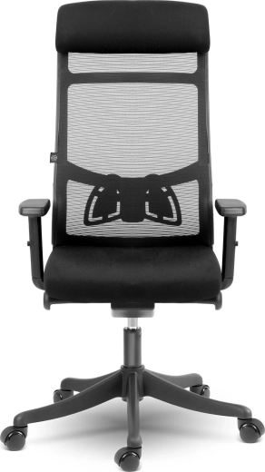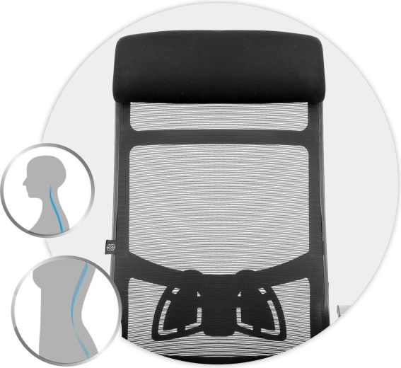 Wysokie oparcie z podporą lędźwiową i mikrosiatką zapewnia zdrowe ułożenie ciała oraz stałą cyrkulację powietrza nawet podczas całodziennego siedzenia.