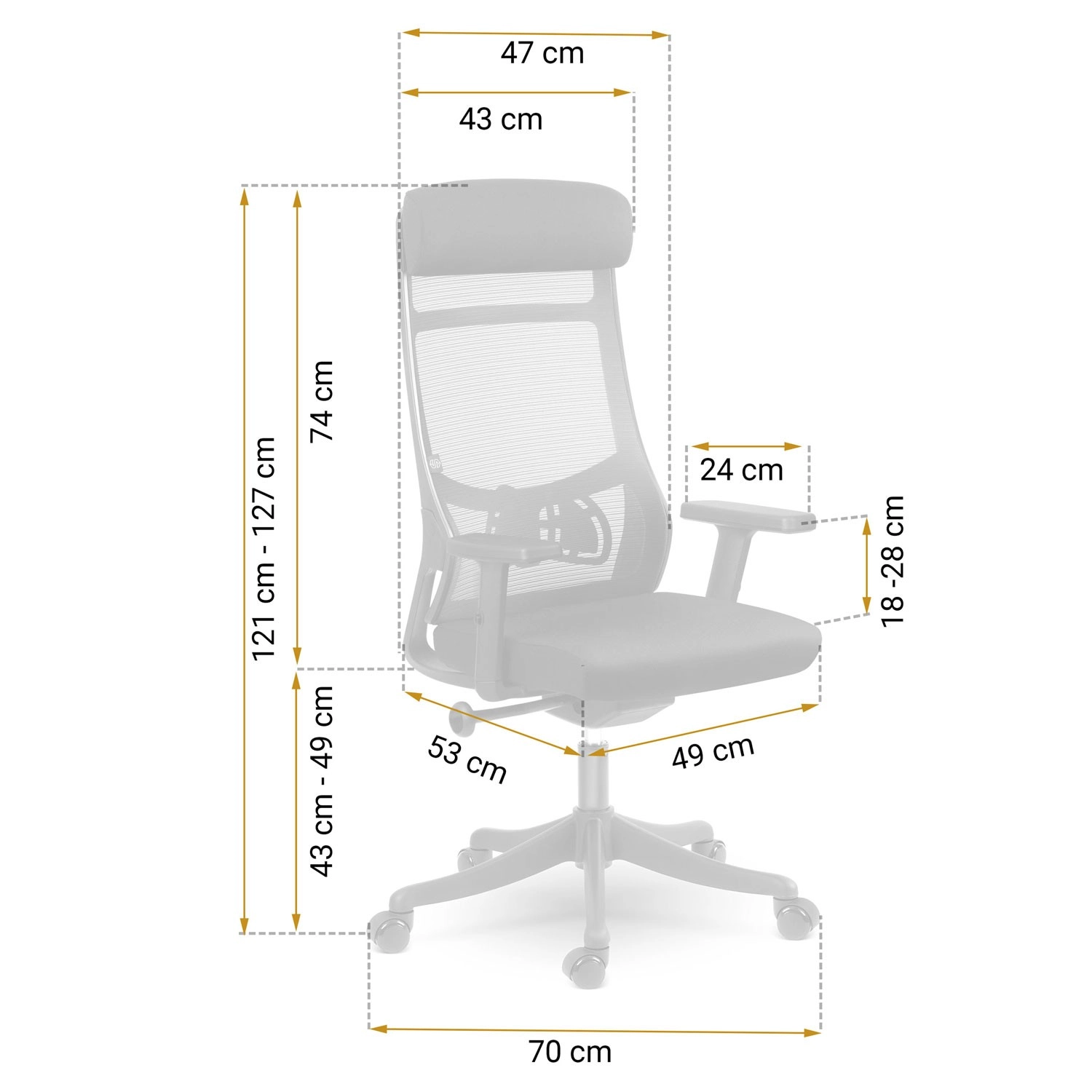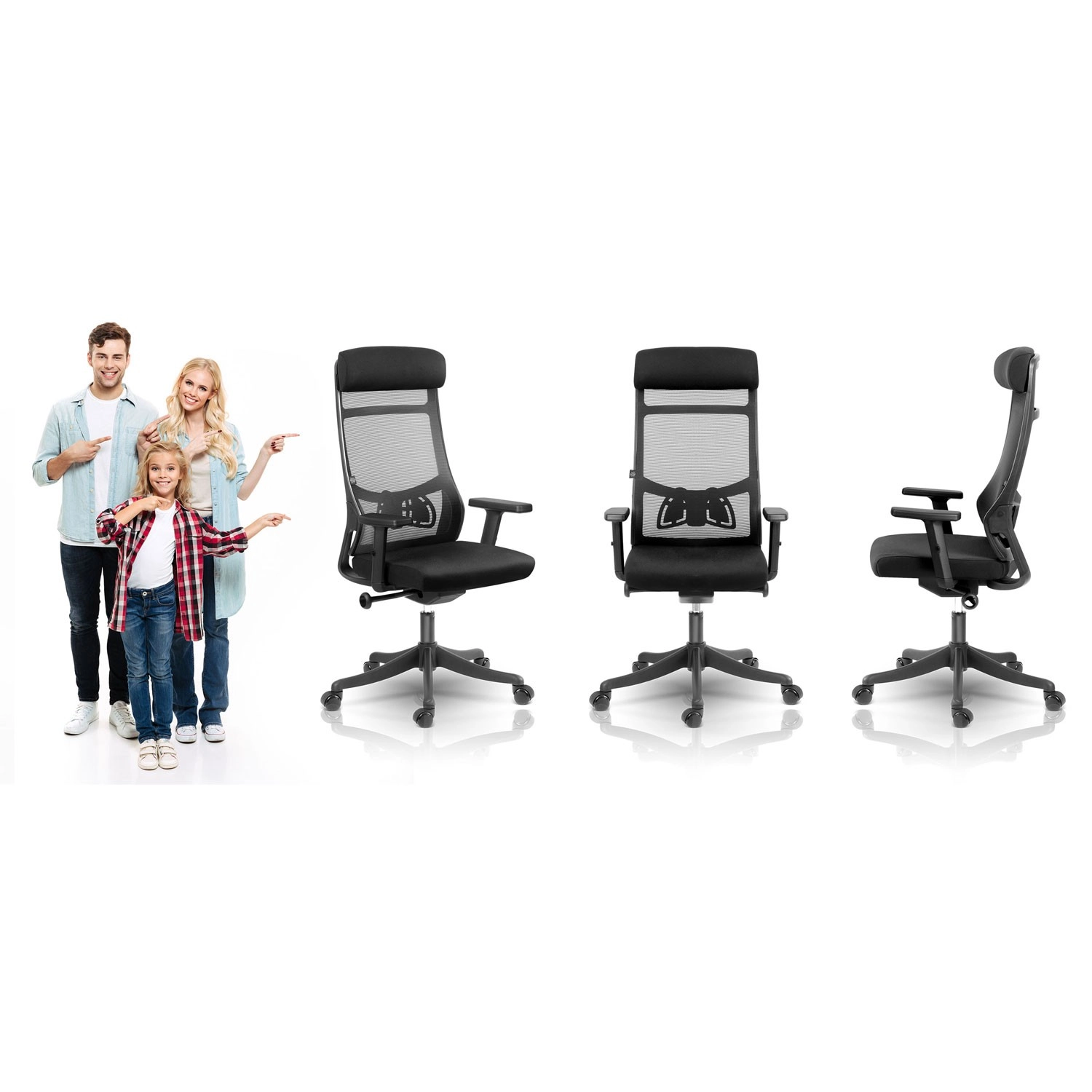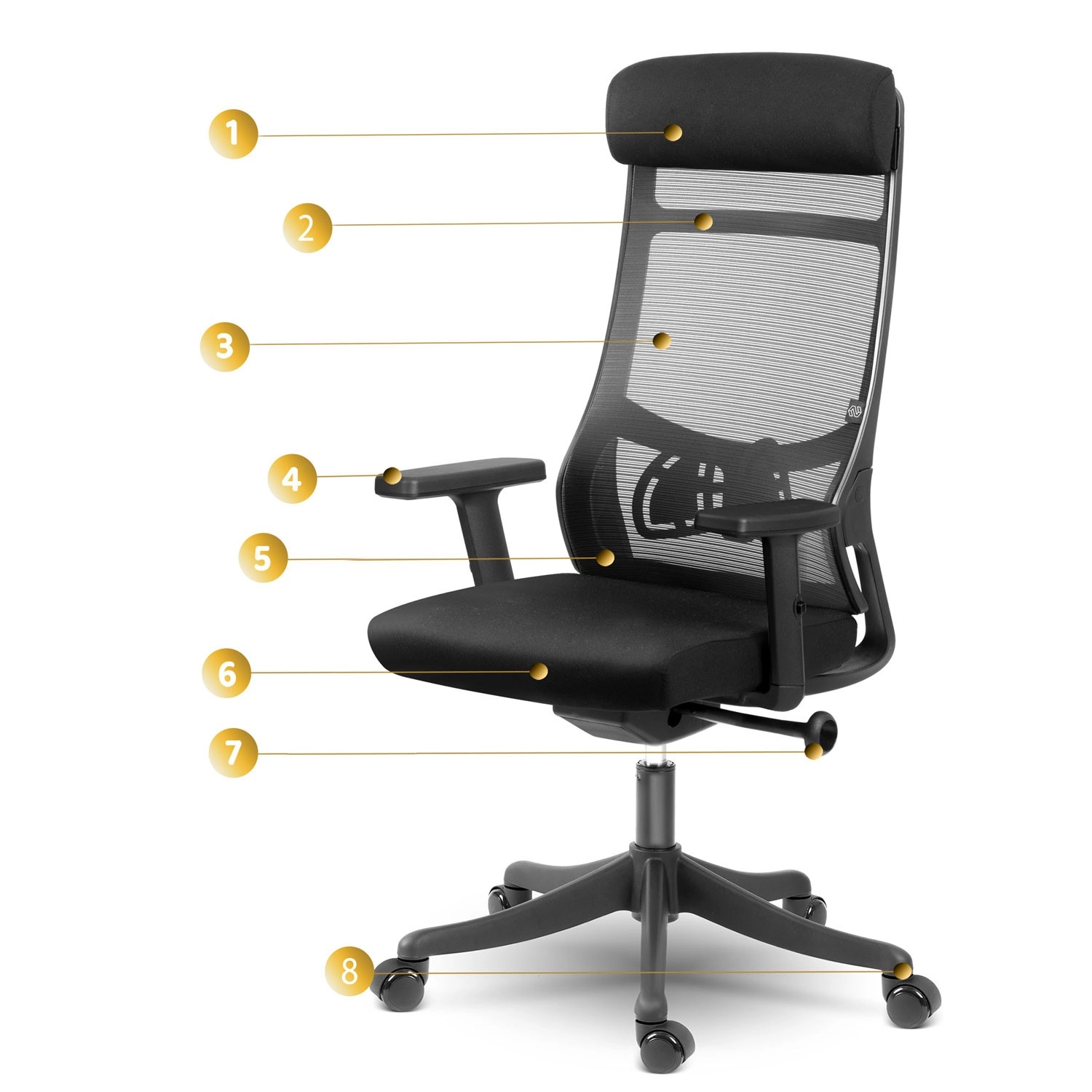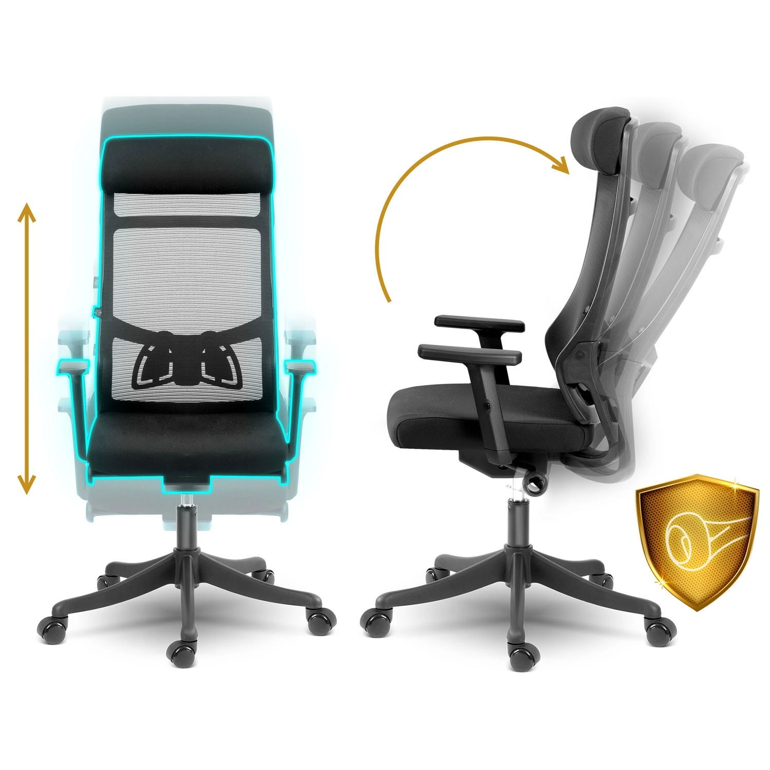 Wysokie oparcie z podporą lędźwiową i mikrosiatką zapewnia zdrowe ułożenie ciała oraz stałą cyrkulację powietrza nawet podczas całodziennego siedzenia.