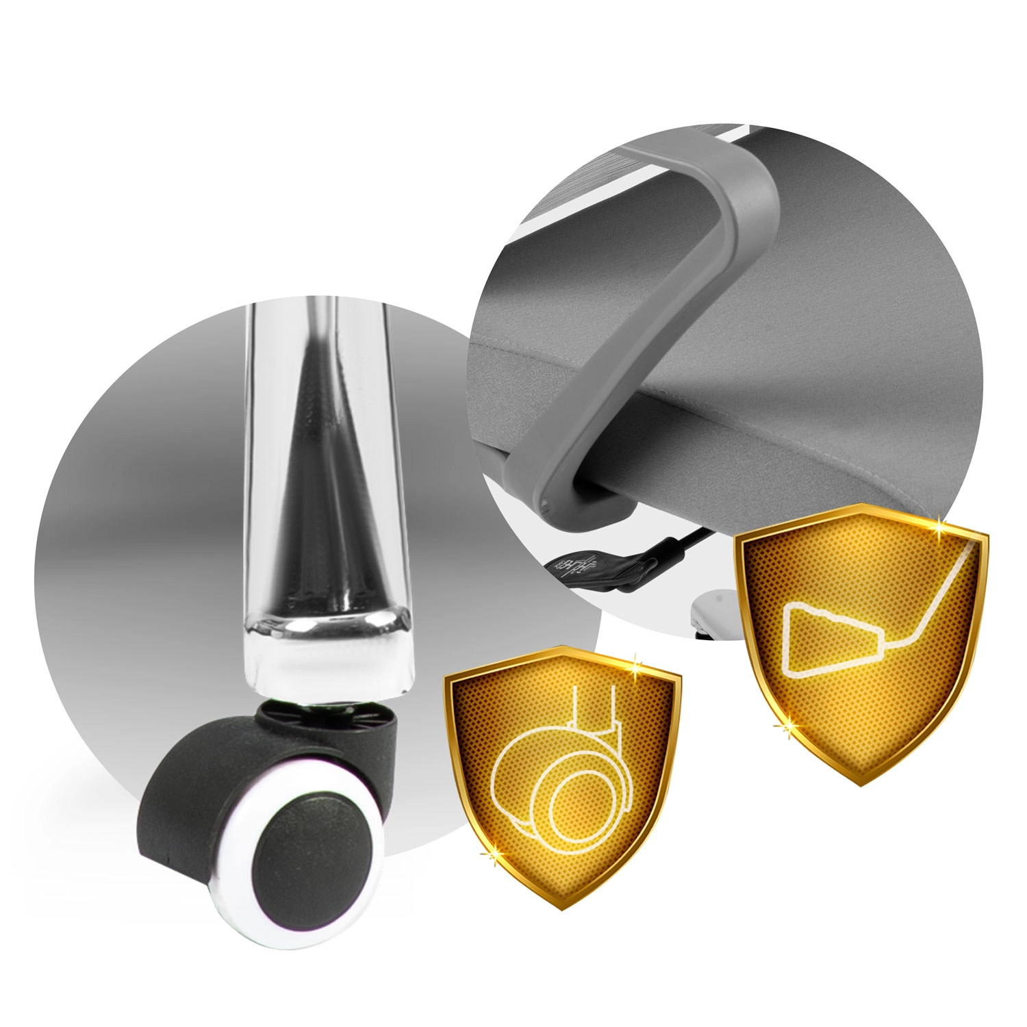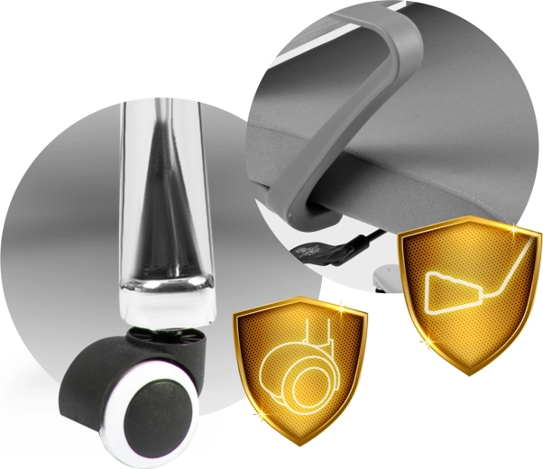 - Ciche kółka z nylonu i kauczuku – płynny ruch i ochrona podłóg.