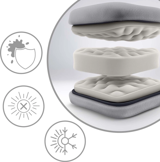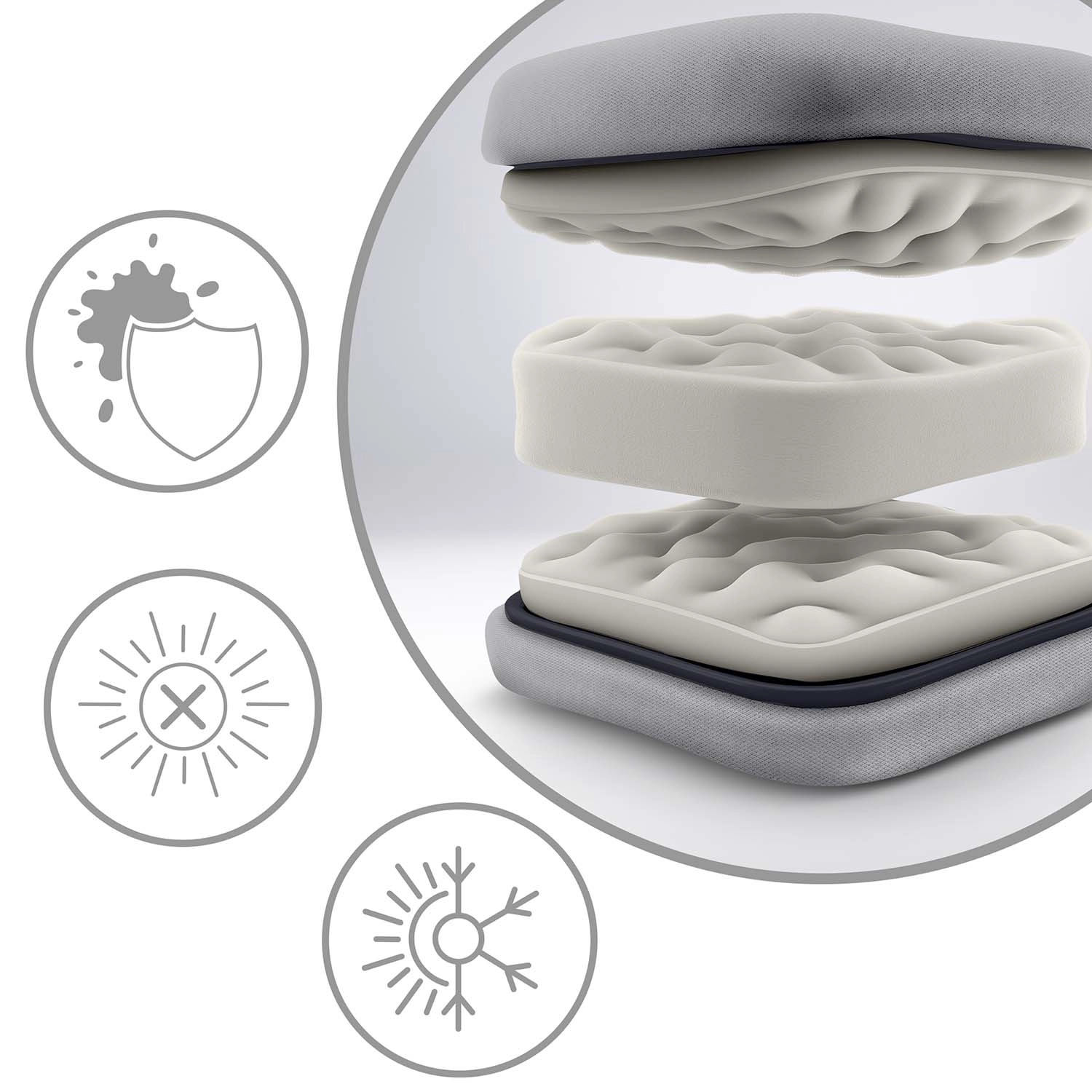 Miękka, pikowana i dobrze wypełniona poduszka z przyjemną w dotyku tapicerką gwarantuje wygodne siedzenie i leżenie przez cały dzień. Zagłówek podpiera głowę i szyję dla jeszcze lepszego relaksu.