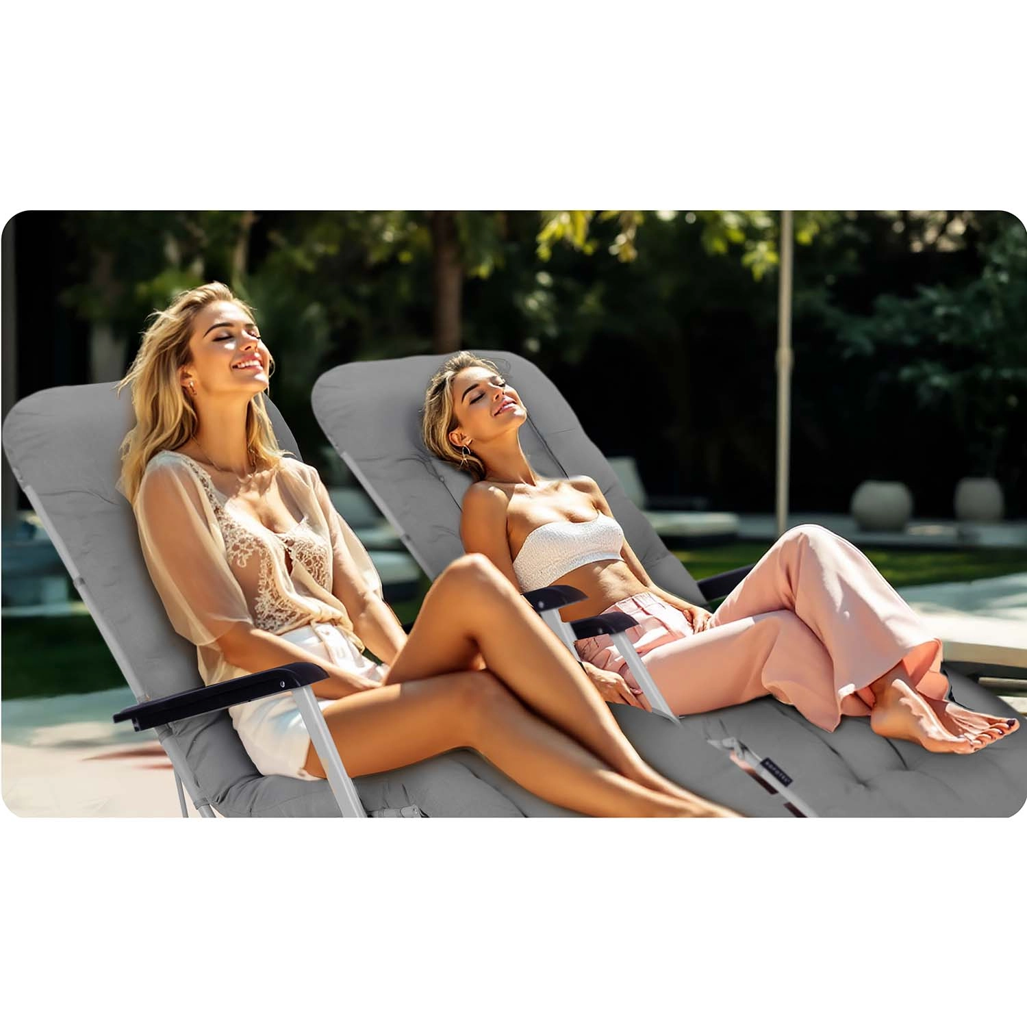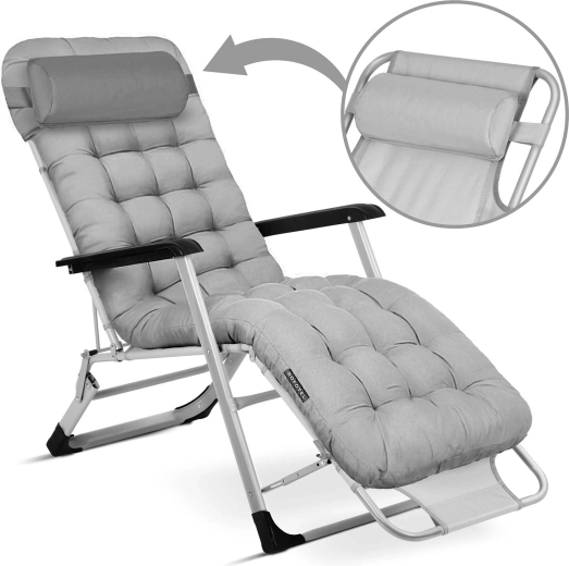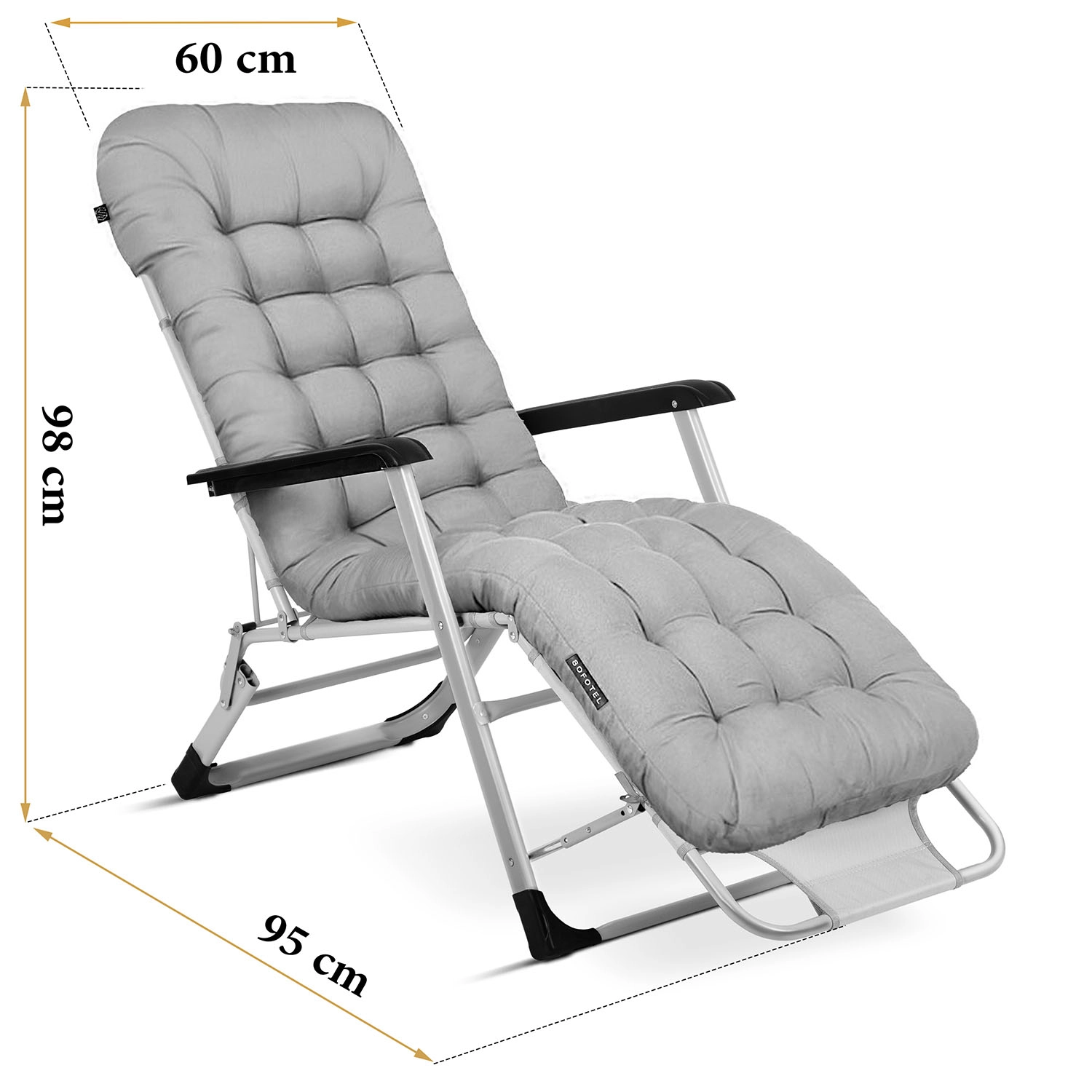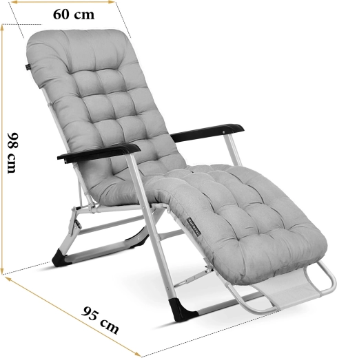 Wytrzymała składana konstrukcja wykonana jest z odpornych materiałów, które łatwo się czyści, nie odkształcają się i są odporne na promieniowanie UV. Praktyczne plastikowe podłokietniki zwiększają komfort, antypoślizgowe końcówki na nogach zapewniają stabilność na różnych nawierzchniach, a szary kolor poduszki pasuje do każdego otoczenia na zewnątrz.