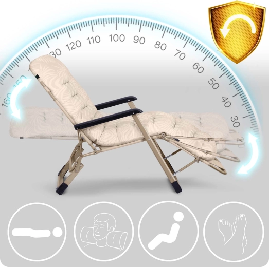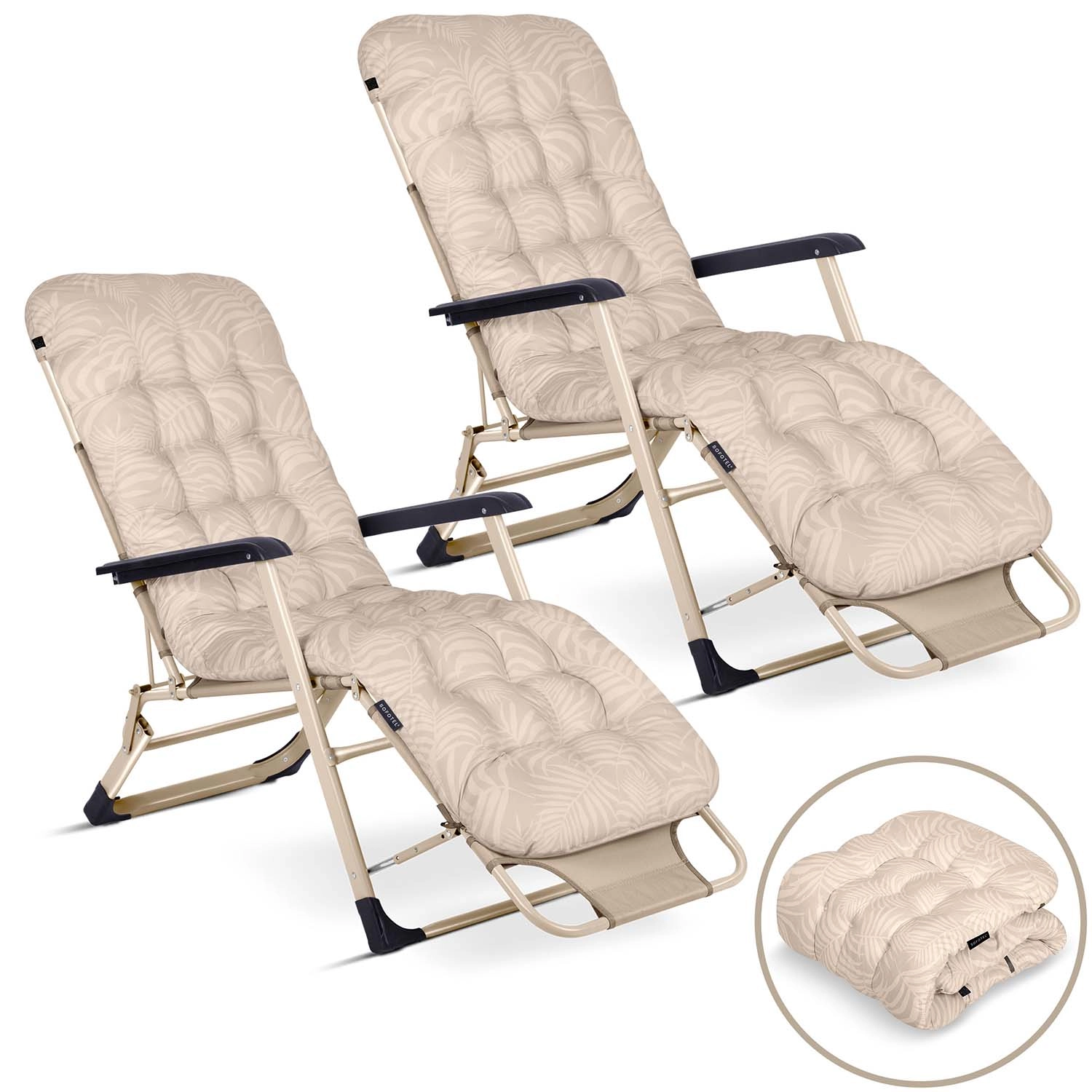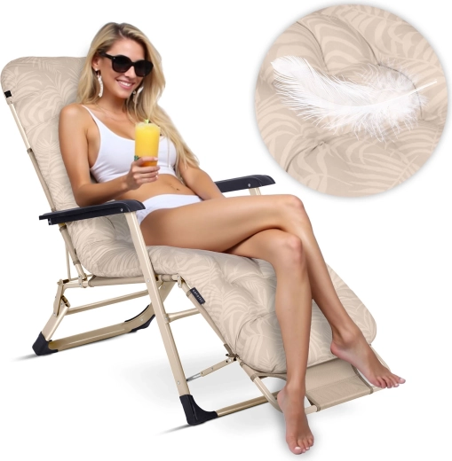Solidna rama o nośności 120 kg jest stabilna i odporna na promieniowanie UV oraz wahania temperatur. Podłokietniki z wytrzymałego tworzywa zwiększają komfort, a antypoślizgowe nasadki na nogach zapewniają pewność na różnych nawierzchniach. Po złożeniu leżaki zajmują minimum miejsca i łatwo mieszczą się w bagażniku — idealne na wakacje, nad basen czy na plażę.